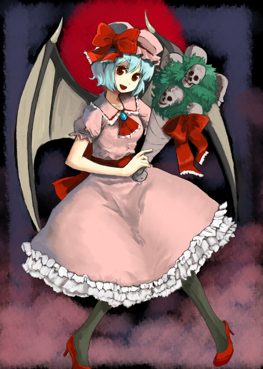 1girlbat wingsblue hairbouquetdressfemale focusflowerhathigh heelspantyhoseplantred eyesshoesshort hairskullsolosymbol-shaped pupilswings