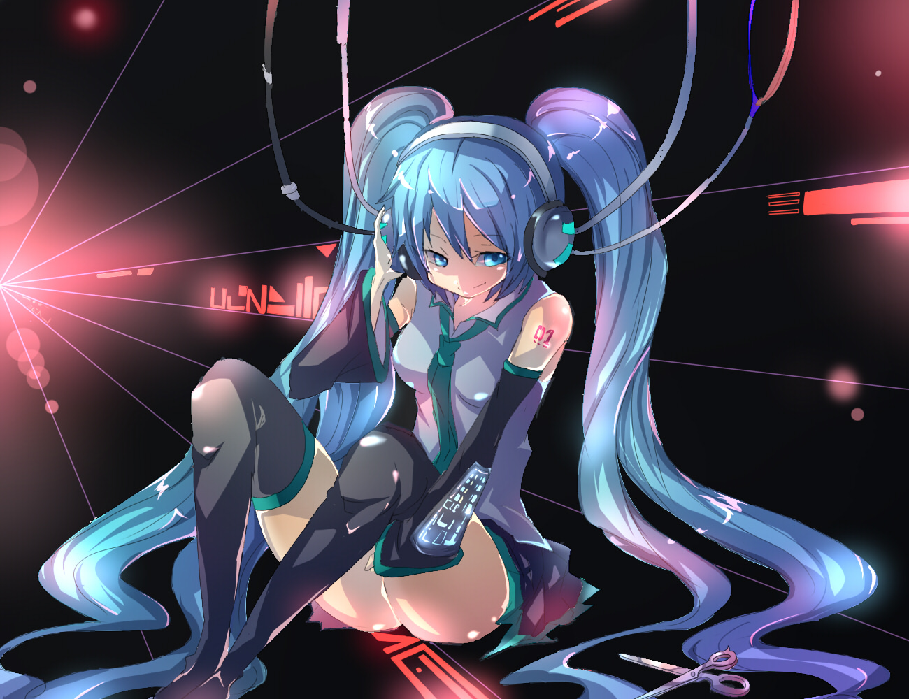 aqua eyesblue hairdetached sleevesheadphoneslong hairnecktiescissorssolothighhighstwintailsvery long hair