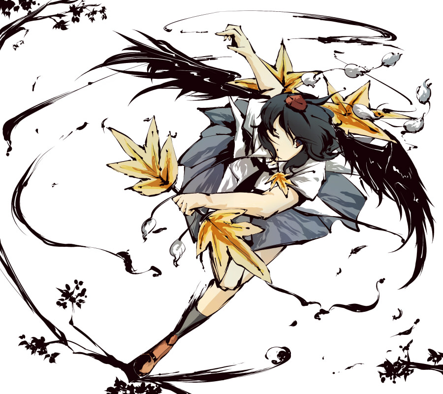 1girlblack hairblack wingsfemale focushatlooking at viewerred eyesshort hairskirtsolotokin hatwings