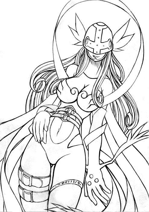 1girlangelangel wingsbreastscovered eyesdigimon (creature)dressfemale focusgreyscalehelmetlong hairmonochromeribbonskin tightsmilesolowhite hairwings