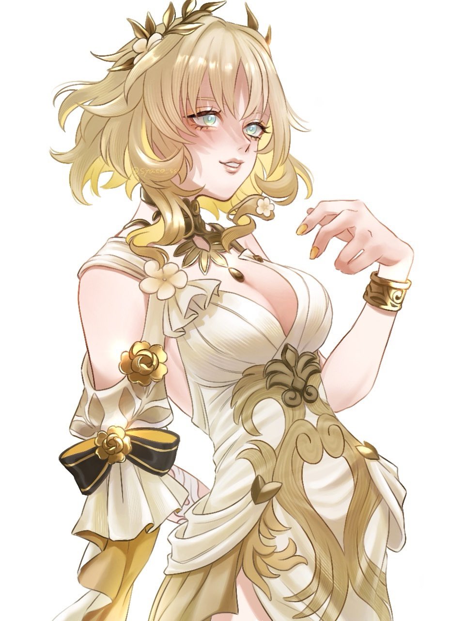 1girlancient greek clothesblonde hairbraceletbreastscleavagedressflowergreco-roman clothesgreen eyeshair flowerhair ornamentjewelrylarge breastslaurel crownparted lipsshort hairsyaco ssstwitter usernamewhite backgroundwhite dressyellow nails