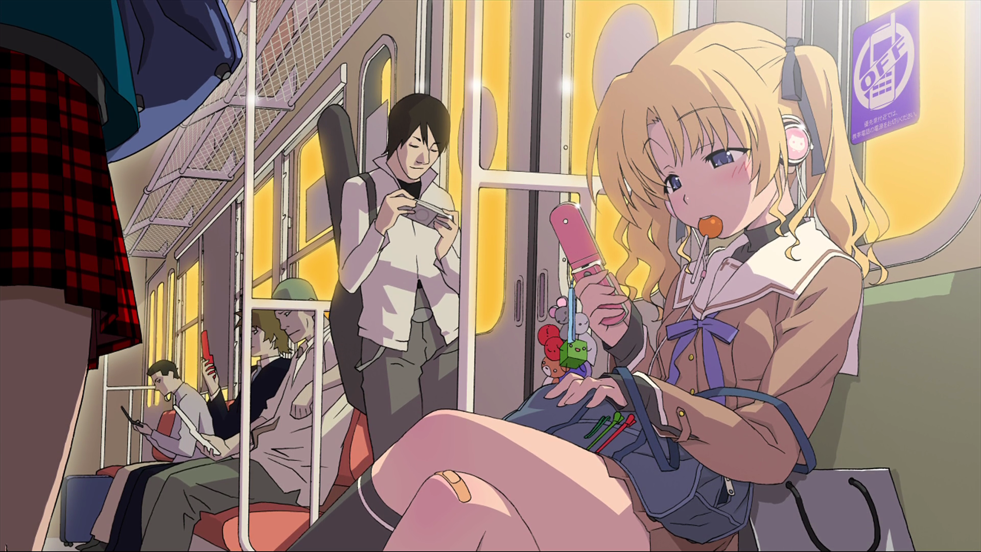 00s2girls4boysblonde hairblue eyescandycellphonecellphone charmcellphone strapcharm (object)earphonesfoodhandheld game consoleheadphoneslollipoplong hairmultiple boysmultiple girlsphoneplaystation portableschool uniformtraintrain interiortwintails