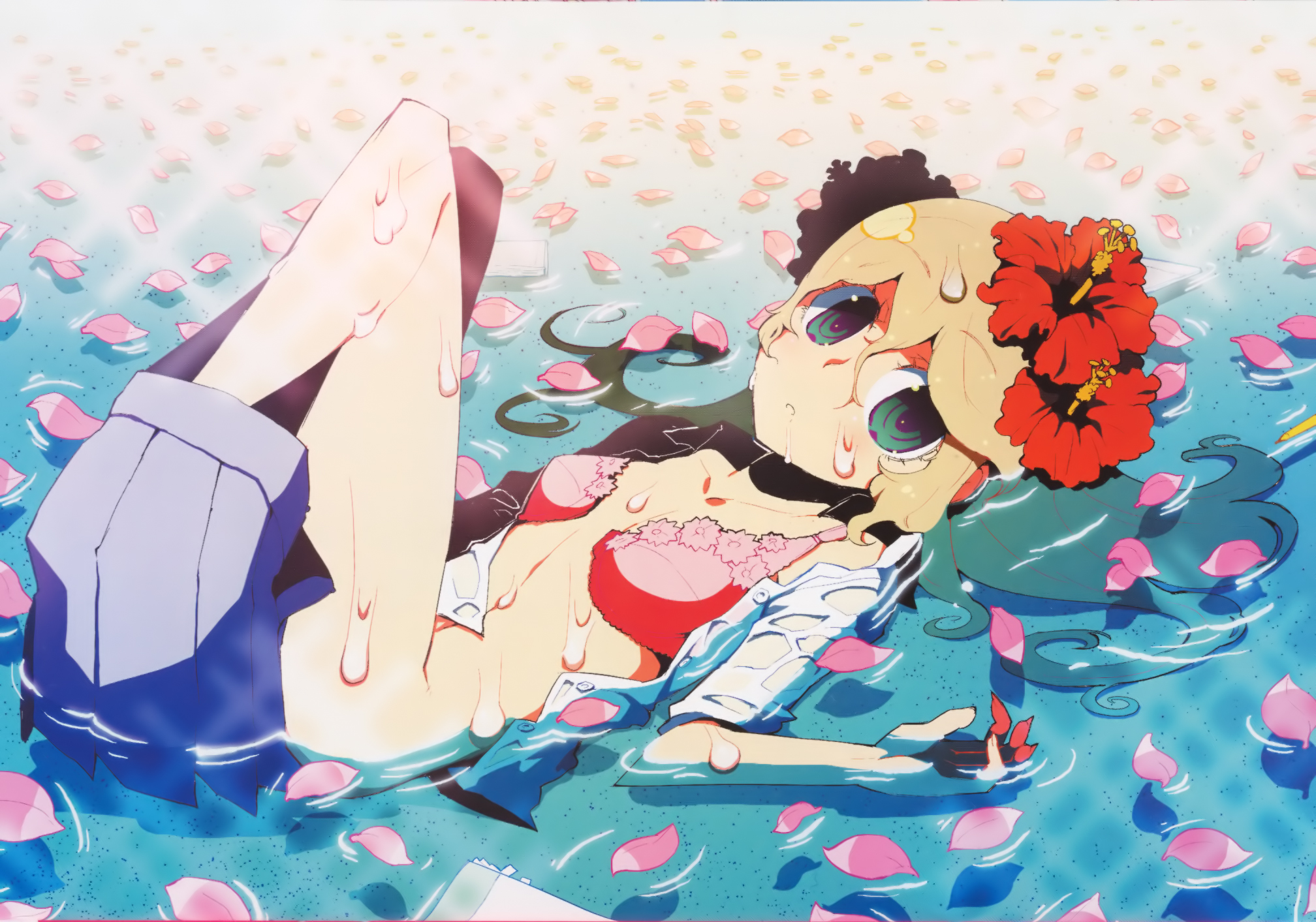 :o1girlblonde hairblue eyesbracherry blossomsclothes pullfemale focusflowerhair flowerhair ornamentlingerielong hairlooking at viewerlyingno pantieson backopen braopen clothesopen shirtpetalsshirtskirtskirt pullsolosubmergedunderwearunfastenedwaterwet