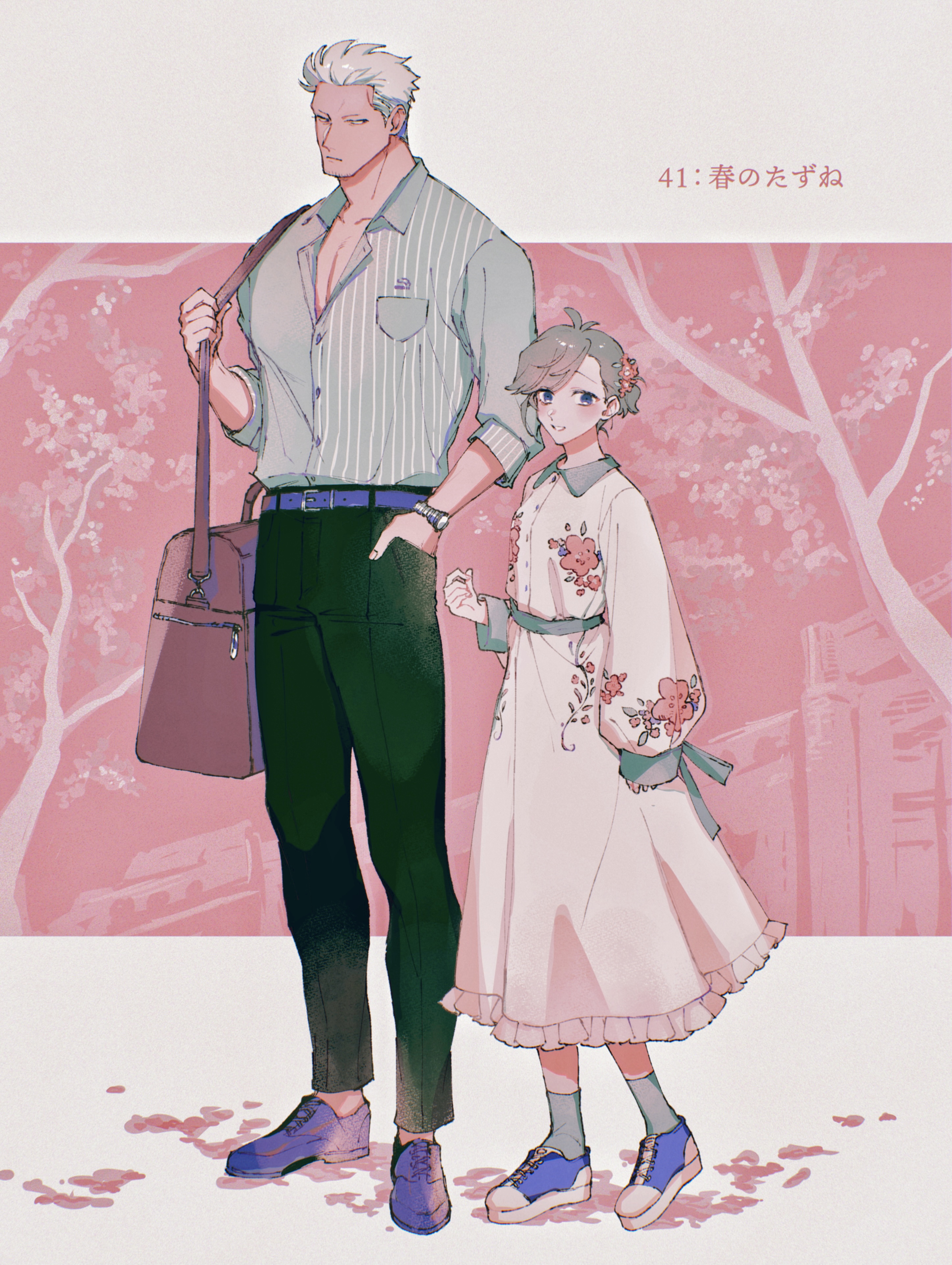 1boy1girlantenna hairarm at sideasymmetrical bangsbagbeltbelt buckleblack pantsblue beltblue shoesbreast pocketbreastsbrown bagbucklebuttonsclosed mouthcollared dresscontrappostocontrast collardressdress shoesfloral printfloral print dressflowerfrilled dressfrillsfrownfull bodygrey hairgrey shirtgrey sockshair flowerhair ornamenthand in pocketheight differenceholding strapjitomelong sleevesoc x canonpantsparted lipspink flowerpocketprint dresssashshirtshirt tucked inshoesshort hairshoulder bagsingle sleeve past wristsmall breastssmilesneakerssocksstandingstriped clothesstriped shirtswept bangsvertical-striped clothesvertical-striped shirtwaist sashwatchwhite dresswhite hairwristwatch