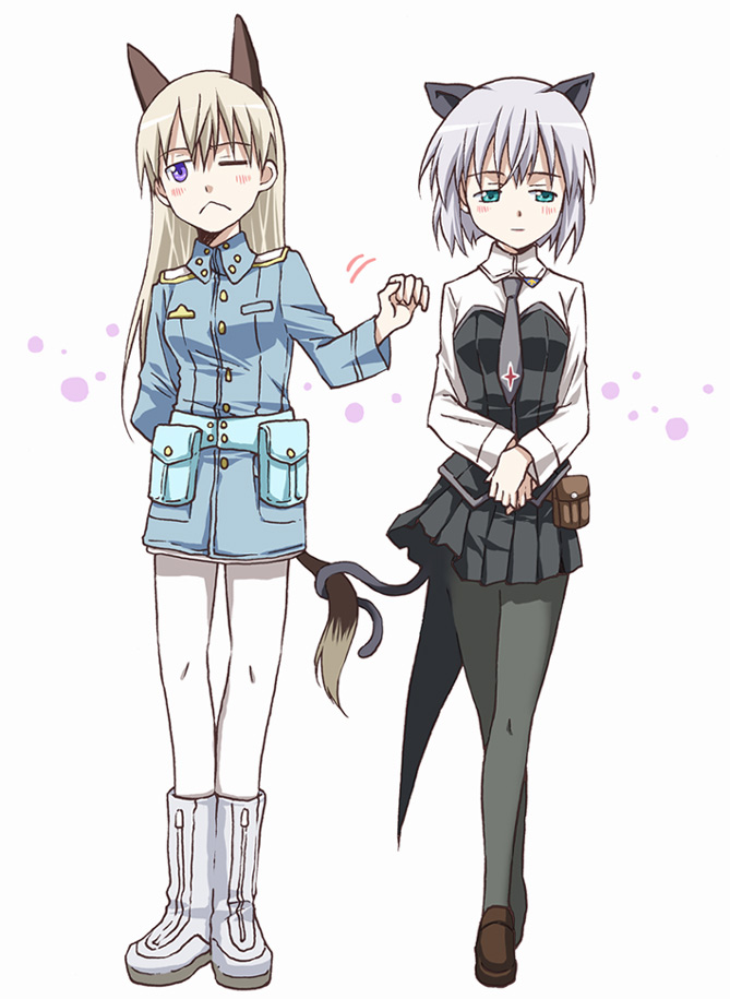 00s2girlsanimal earsblack pantyhoseblue eyesblushcat earscat tailgreen eyesmultiple girlsone eye closedpantyhosetailwhite pantyhosewink