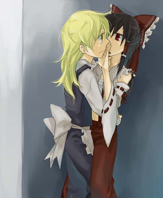 2girlsblack hairblonde hairdetached sleevesfemale focushugjapanese clotheskissmikomultiple girlsyuri