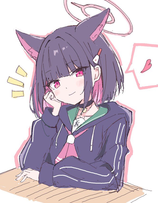 1girlanimal earsblack chokerblack hairblack hoodieblushbreastscat chokercat earscat girlchokercolored inner animal earscolored inner hairextra earshair ornamenthalohoodhoodiejacketlong sleeveslooking at viewermulticolored hairneckerchiefpink hairpink halopink neckerchiefred eyesshirtshort hairsolotrinity general school logotwo-tone hair