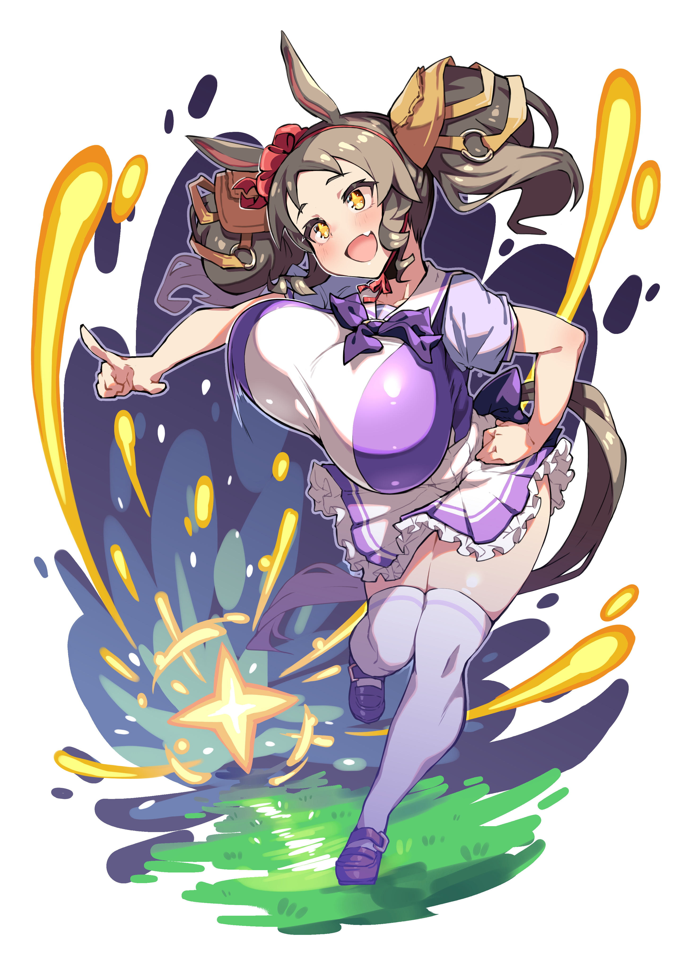 1girlanimal earsblack hairbreastscurvyexcitedfanggrasshand on own hiphead tilthorse earshorse girlhorse tailhuge breastskneehighslooking to the sidemedium hairon grassopen mouthpointingpointing forwardpurple sailor collarsailor collarschool uniformskirtsockssolostar (symbol)tailthick thighsthighhighsthighstracen school uniformtwintailswhite backgroundwhite thighhighs
