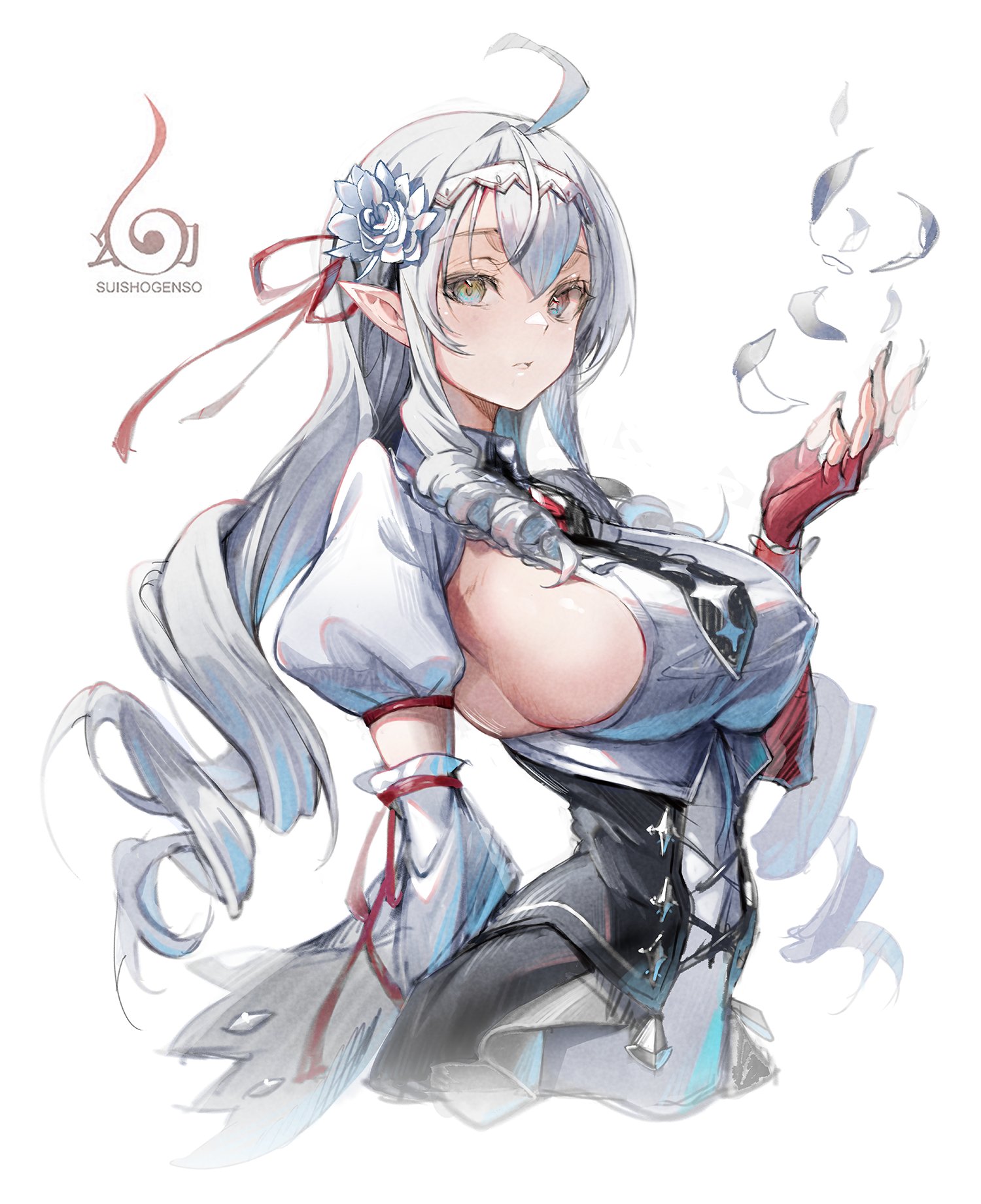 1girlahogeblue eyesbreastsdetached sleevesdresselbow glovesfingerless glovesflowergloveshair flowerhair ornamenthakka vanillalarge breastslong hairlooking at viewerred glovesroseshort sleevessideboobsoloupper bodyvirtual youtuberwhite dresswhite flowerwhite hairwhite rose