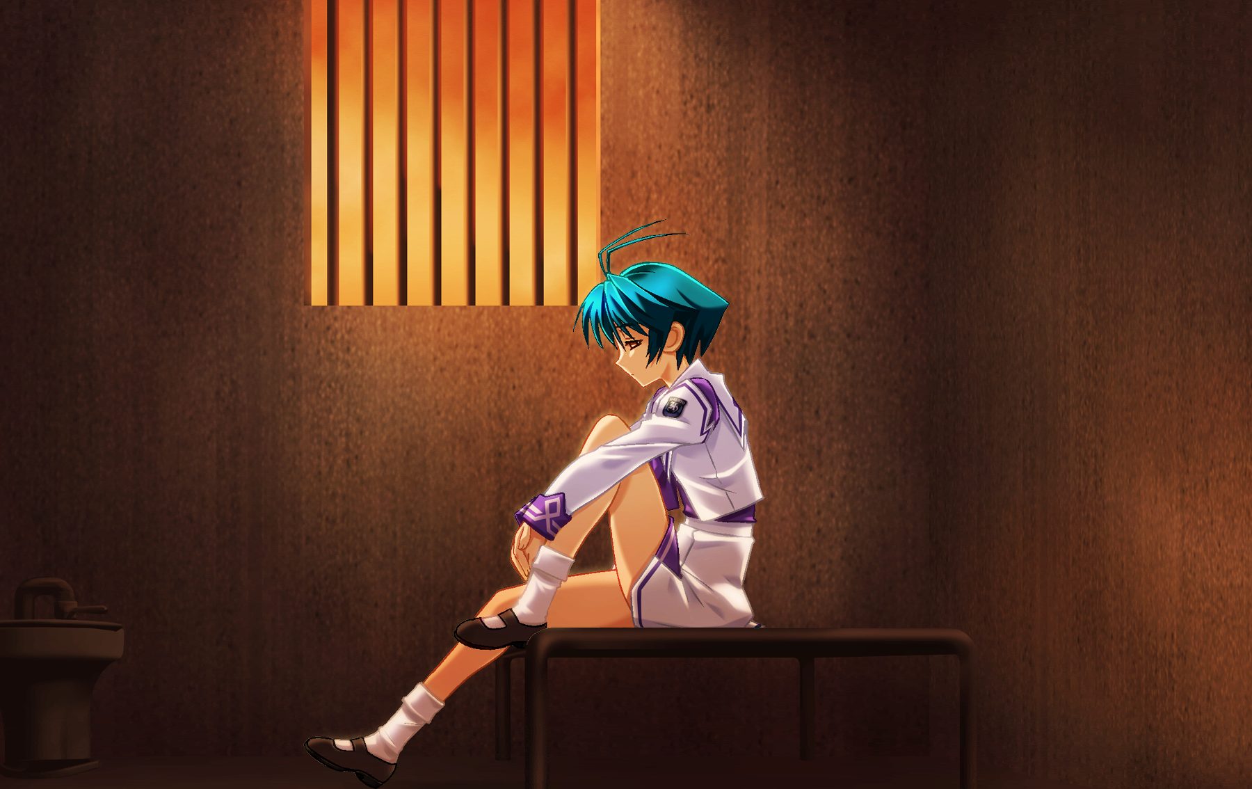 1girlantenna hairblue hairfemale focusleg upprisonsceneryschool uniformshort hairsittingskirtsockssolosunsetwindow