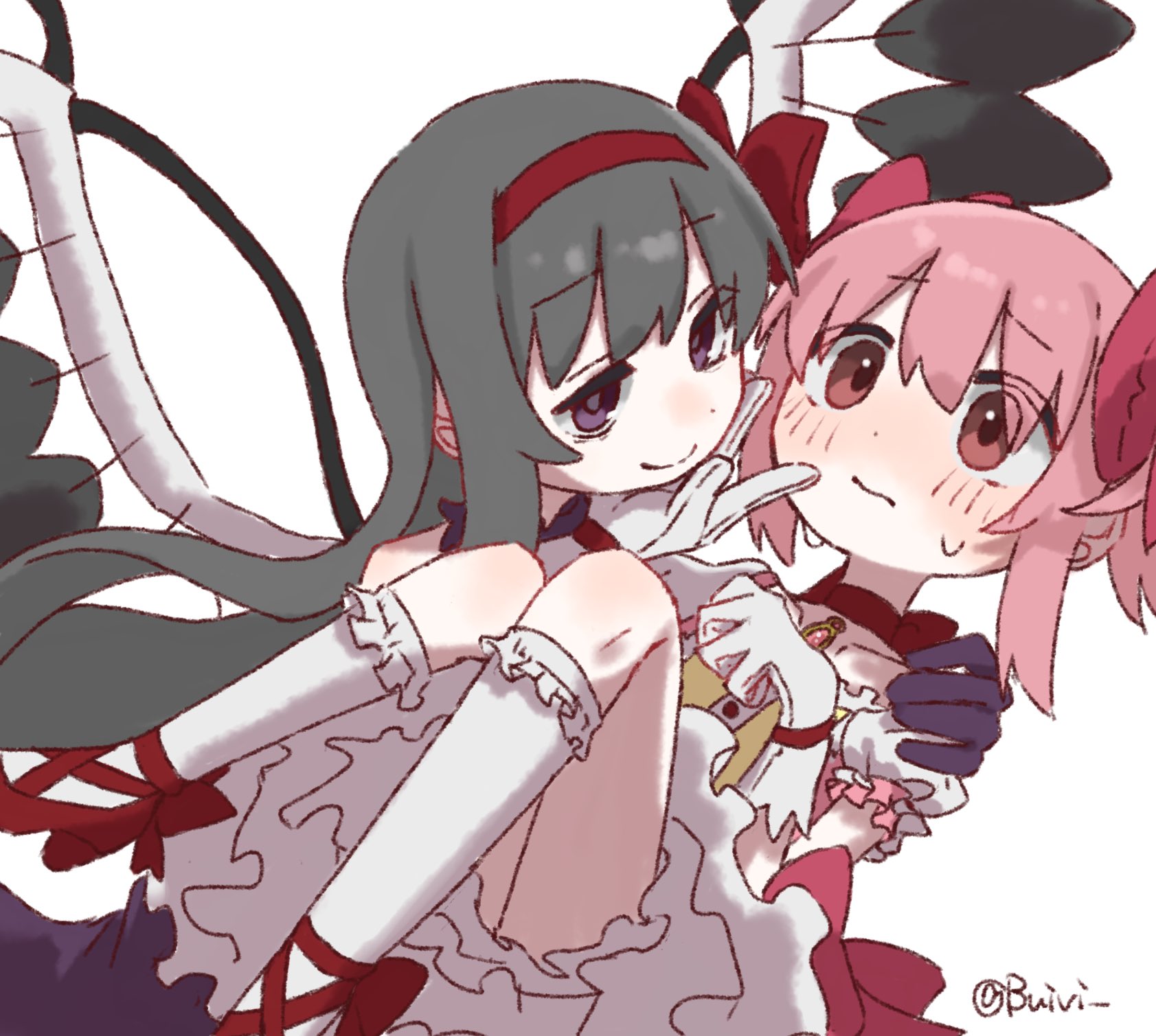 2girlsblack hairblushclosed mouthgloveshairbandhand on another's shoulderkneehighslong hairmultiple girlspink eyespink hairprincepurple eyespurple glovesred hairbandred shoesshoessimple backgroundsmilesockssweattwintailswhite backgroundwhite gloveswhite sockswingsyuri
