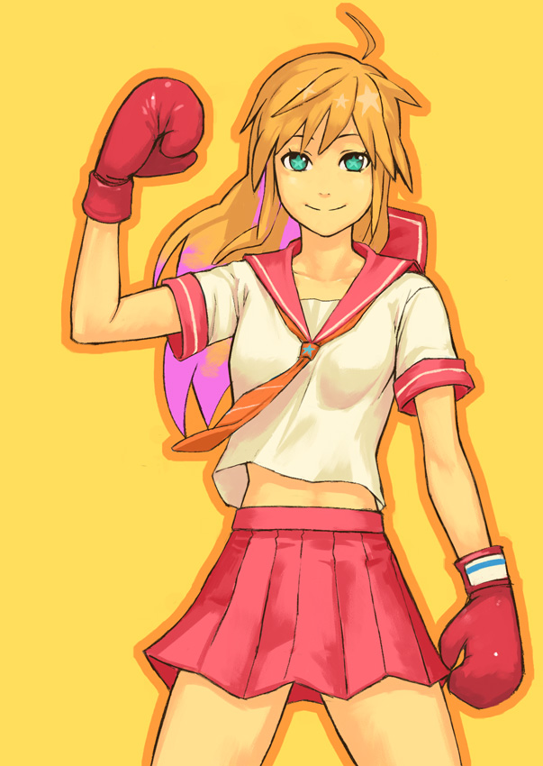 1boy1girlahogeblonde hairblue eyesboxing glovescowboy shoteye twinklefemale focusgradient hairgreen eyesmidriffmulticolored hairpurple hairschool uniformserafukusimple backgroundsolosymbol-shaped pupilswindyellow background