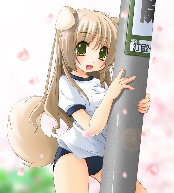 1girlanimal earsblurrybokehburumacherry blossomsdepth of fielddog earsdog tailfemale focusgym uniformpetalssolotailyellow eyes