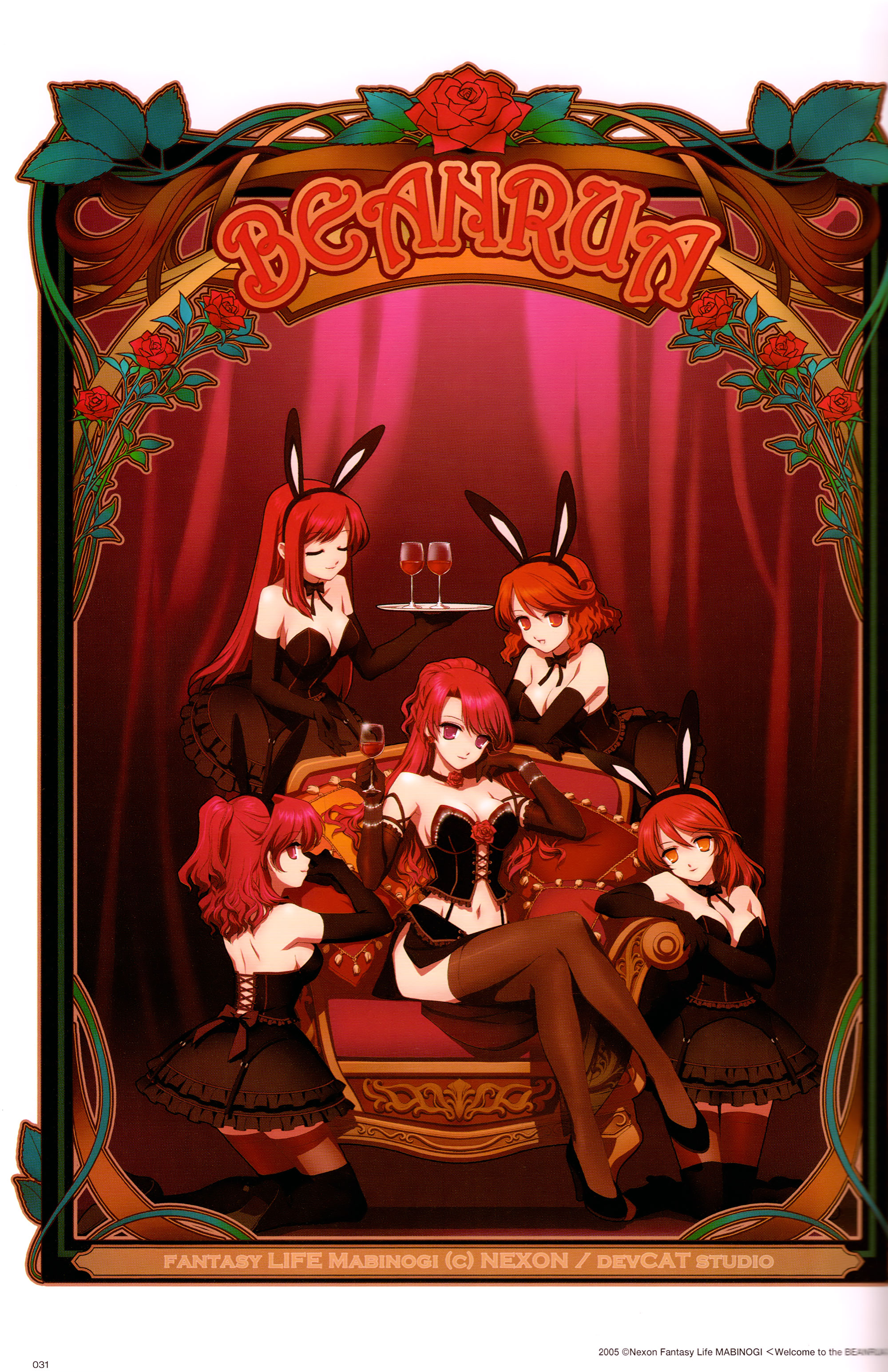 5girlsalcoholanimal earsbreastscleavagecorsetfoodhigh heelskneelinglingeriemultiple girlspopcornrabbit earsred eyesred hairshoessittingskirtthighhighsunderwearwinezettai ryouiki