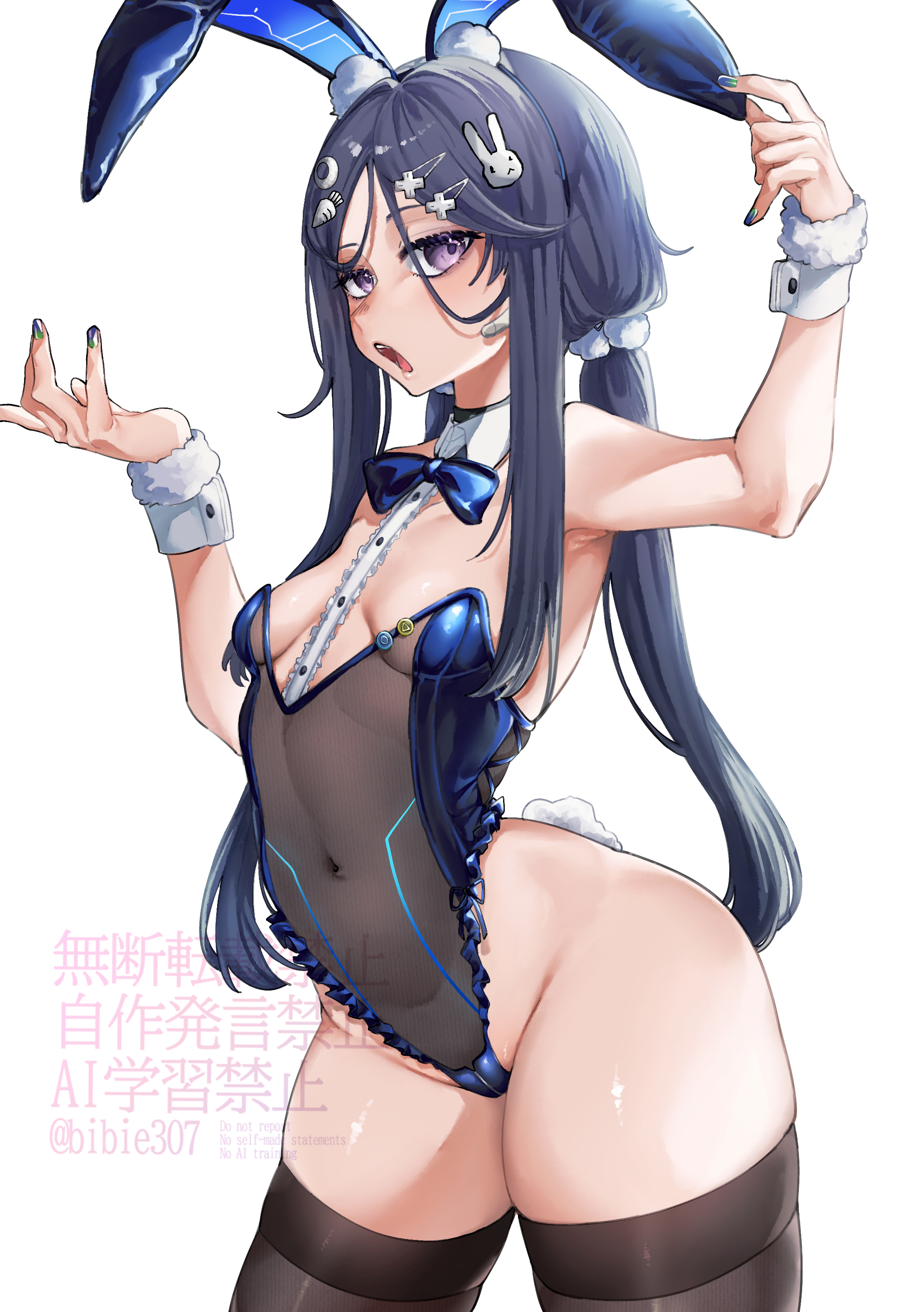 1girlanimal ear hairbandanimal earsarmpitsblack hairblack thighhighsblue leotardbreastscrescentcrescent hair ornamentfake animal earsfake tailhair ornamenthairbandhighleghighleg leotardleotardlow twintailsofficial alternate costumeofficial alternate hairstyleopen mouthplayboy bunnypurple eyesrabbit ear hairbandrabbit earsrabbit hair ornamentrabbit tailsee-through clothessee-through leotardsmall breastssolotailthighhighstwintailsvirtual youtuberwhite backgroundwrist cuffs