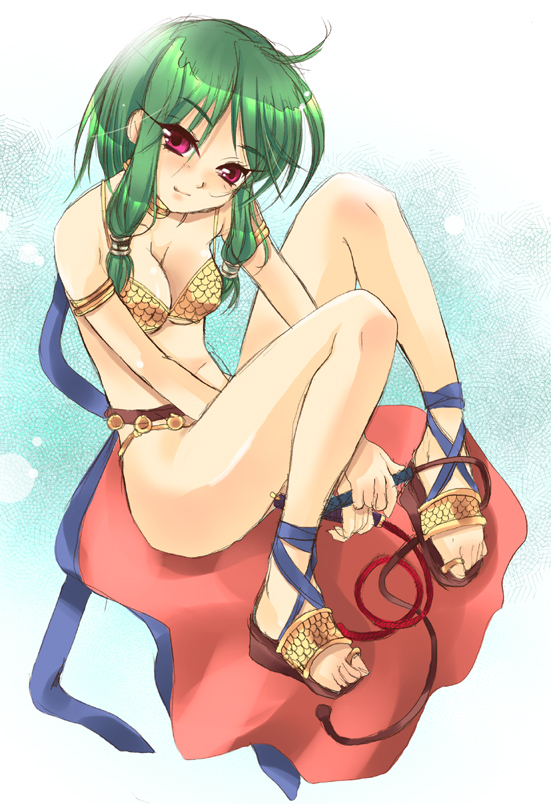 1girlahogebikiniblue backgroundbreastsbrown sandalscleavageclosed mouthcoin (ornament)full bodygreen hairholdingholding whiplong hairlooking at viewermedium breastsred eyessandalssidelockssittingsmilesoloswimsuityellow bikini