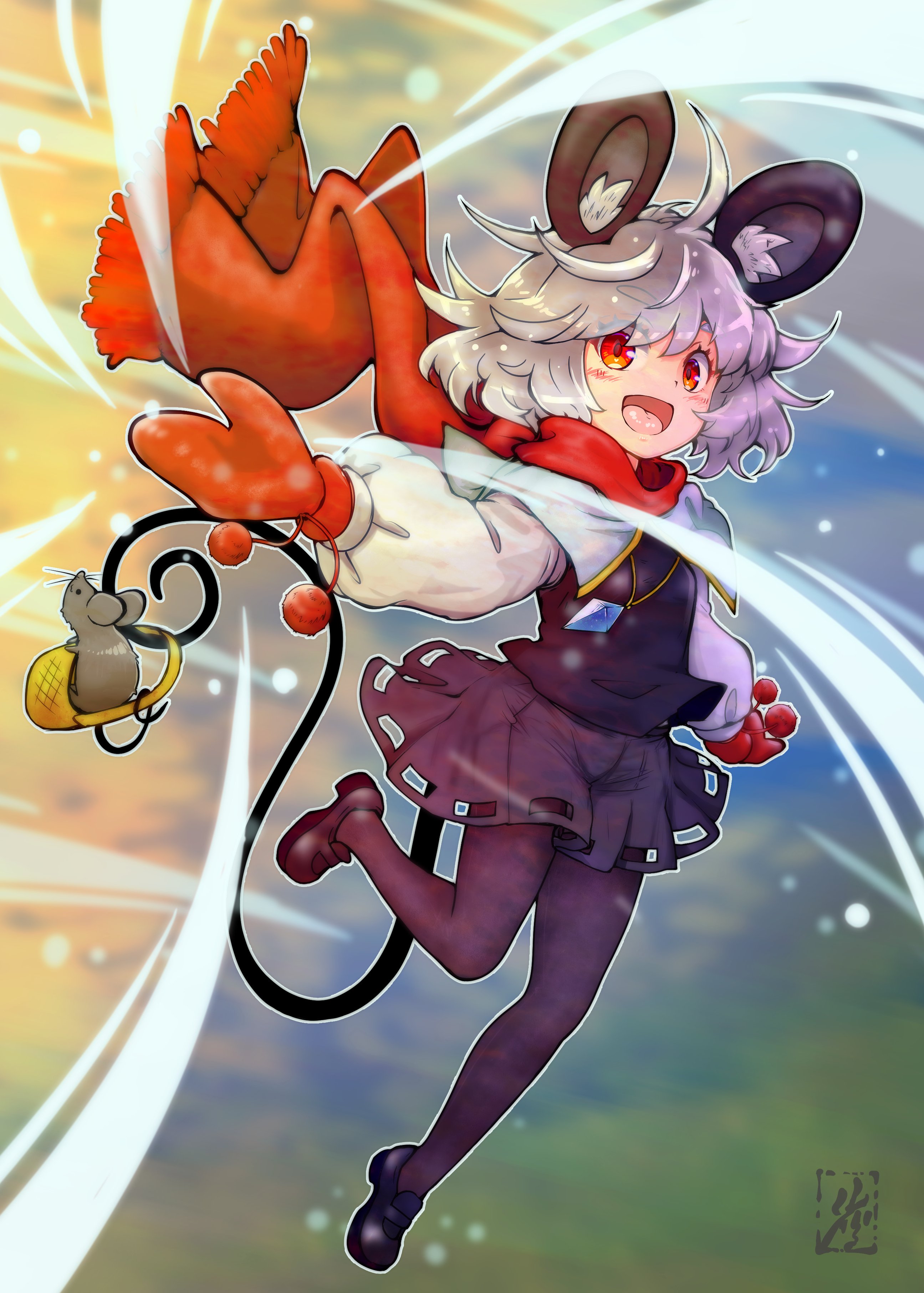 1girlanimal earsblushcapeletdowsing roddressglovesgrey hairjewelrylong sleeveslooking at viewermouse (animal)mouse earsmouse girlmouse tailopen mouthpendantred eyesred glovesred scarfscarfshirtshort hairskirtsmilesolotailwindwinter