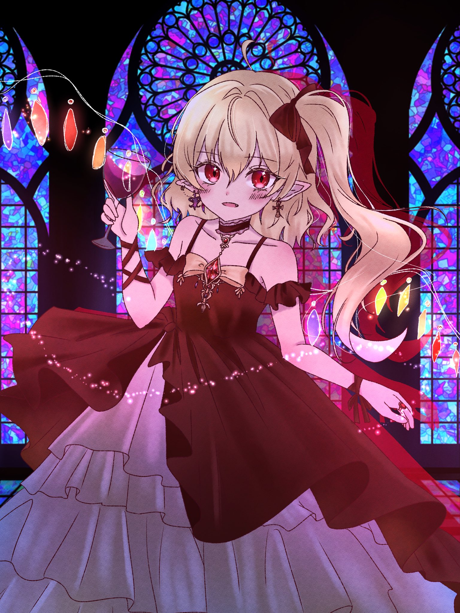1girlascotblonde hairbowcrystalcrystal wingscupdressdrinking glasslooking at viewermarimohu starrymulticolored wingsopen mouthred dressred eyesred vestribbonshort hairside ponytailskirtsmilesolostained glassvampirevestwine glasswingsyellow ascot