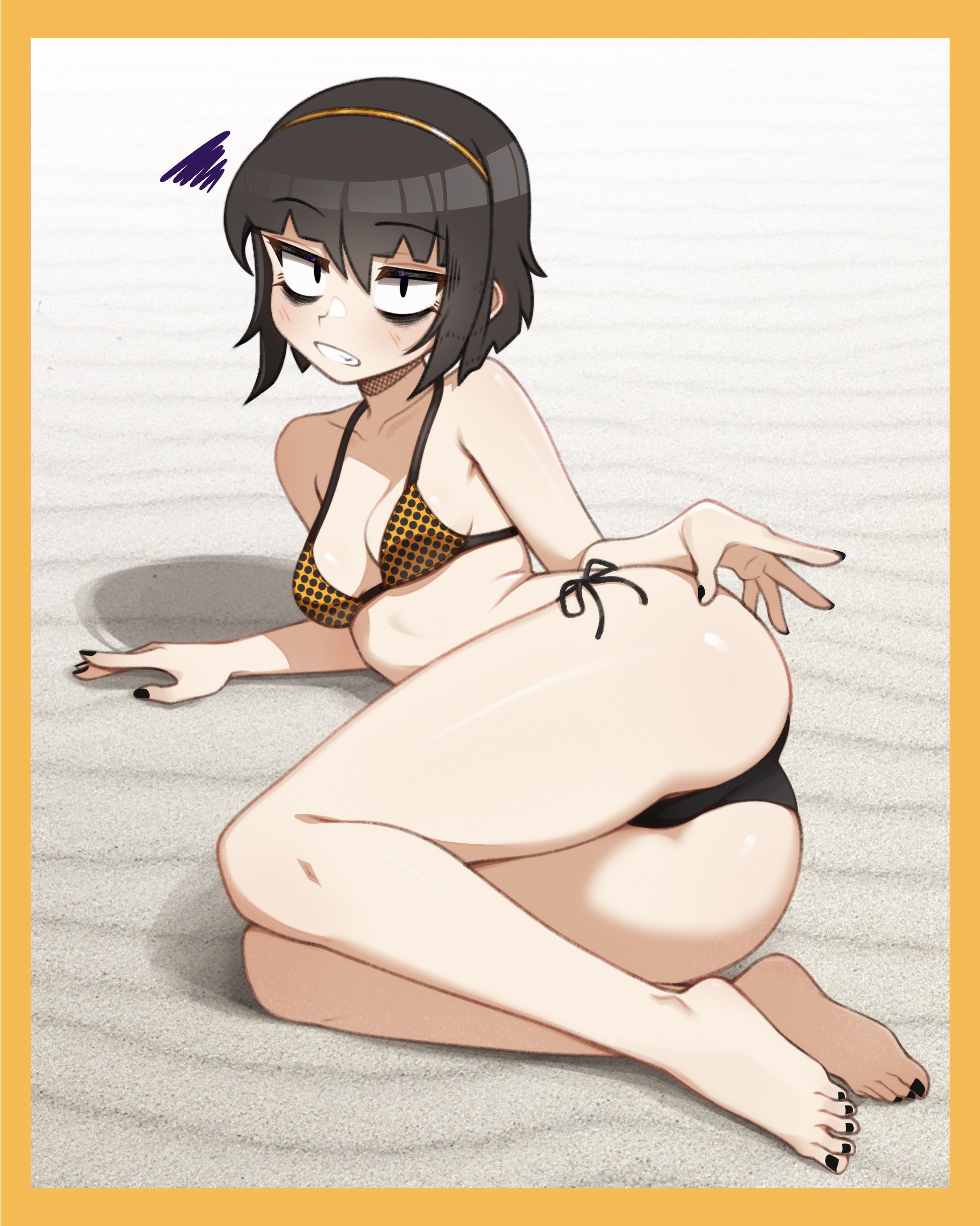 1girlassbare armsbare legsbare shouldersbarefootbikiniblack bikiniblack eyelinerblack eyesblack eyeshadowblack hairblack nailsborderbreastsclenched teetheyelinereyeshadowfeetfingernailsgold hairbandhairbandlegslight blushlooking at viewerlyingmakeupmedium breastsmismatched bikininail polishon sidepolka dotpolka dot bikinisandshort hairside-tie bikini bottomsolosquiggleswimsuitteeththighstoenail polishtoenailstoesyellow bikiniyellow border