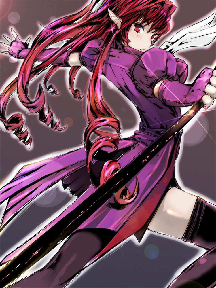 bowbow (weapon)drill hairfingerless glovesforeshorteninggloveslong hairpointy earsred eyesred hairsolothighhighsweapon