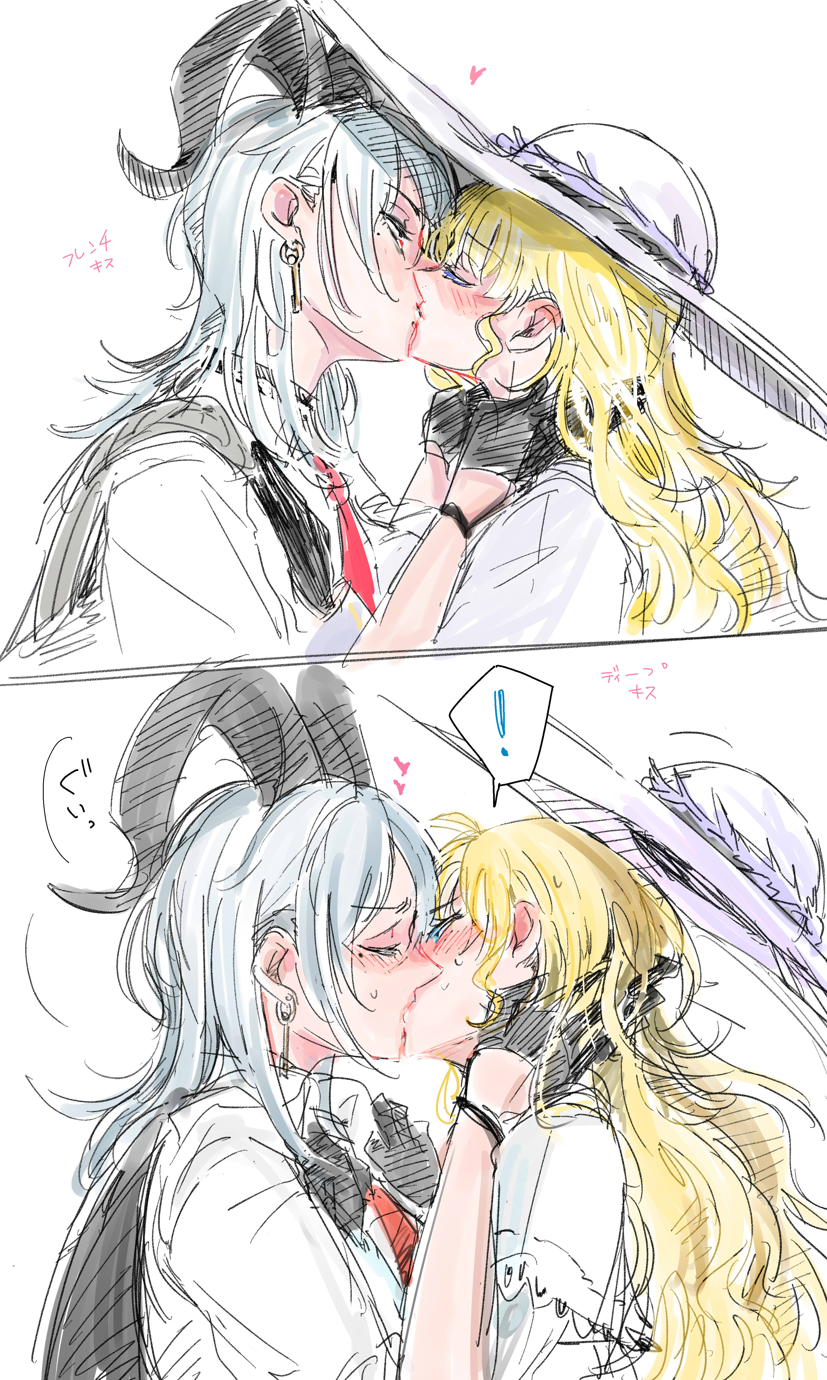 2girlsblack glovesblonde hairblushclosed eyesclothes grabearringsgloveshand on another's neckhathornsjewelrykey earringskisslarge hatmolemole under eyemultiple girlsnecktiepurple hatred necktieshirt grabsimple backgroundsweatwhite backgroundwhite hairyuri