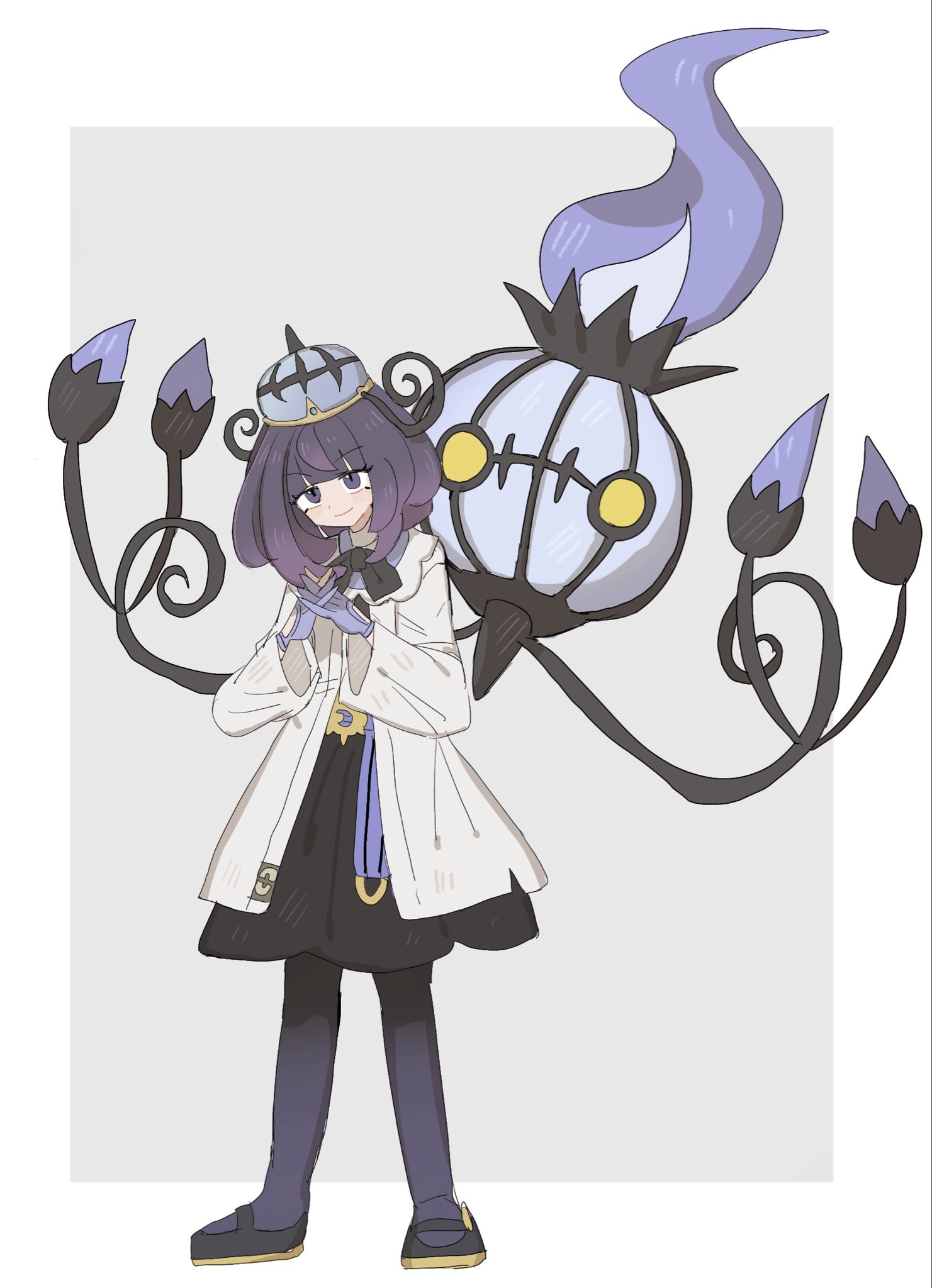 1girlblack dressblack hairblack shoesblunt bangsbob cutclosed mouthcoatdresseyelashesfull bodygen 5 pokemonglovesgradient hairhatinterlocked fingerslong sleeveslooking at viewermulticolored hairopen clothesopen coatpantyhosepartially fingerless glovespokemon (creature)purple eyespurple hairshoesshort hairsimple backgroundsmilestandingwhite coat