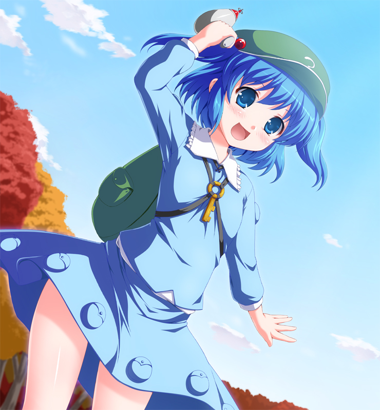 1girlbackpackbagblue eyesblue hairclouddayfemale focusgunhair bobbleshair ornamenthatkeymatching hair/eyesopen mouthrandoseruskirtskysmilesolotwintailstwo side upweapon