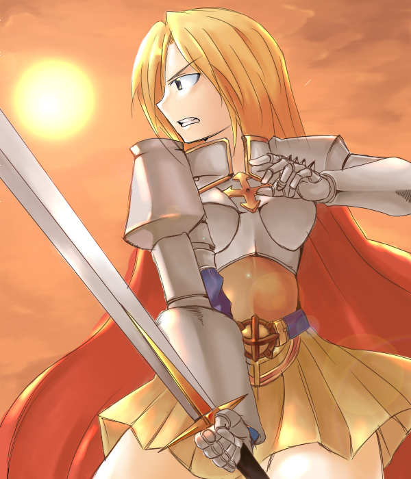 1girl2000s (style)armorbeltblonde hairblue beltboobplatebreastplatecapeclenched teethcowboy shotcrossfighting stanceholdingholding swordholding weaponlong hairlooking afarorange skypauldronspleated skirtred capeshoulder armorskirtskysolospiked gauntletssunswordteethv-shaped eyebrowsweaponyellow skirt