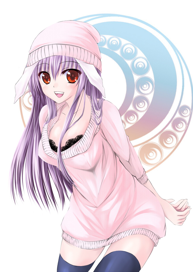 1girlalternate costumeanimal earsarms behind backbeaniebracasualcontemporarydressfemale focushatleaning forwardlingerieopen mouthpink hairpurple hairrabbit earsred eyessmilesolosweatersweater dressthighhighsunderwearzettai ryouiki
