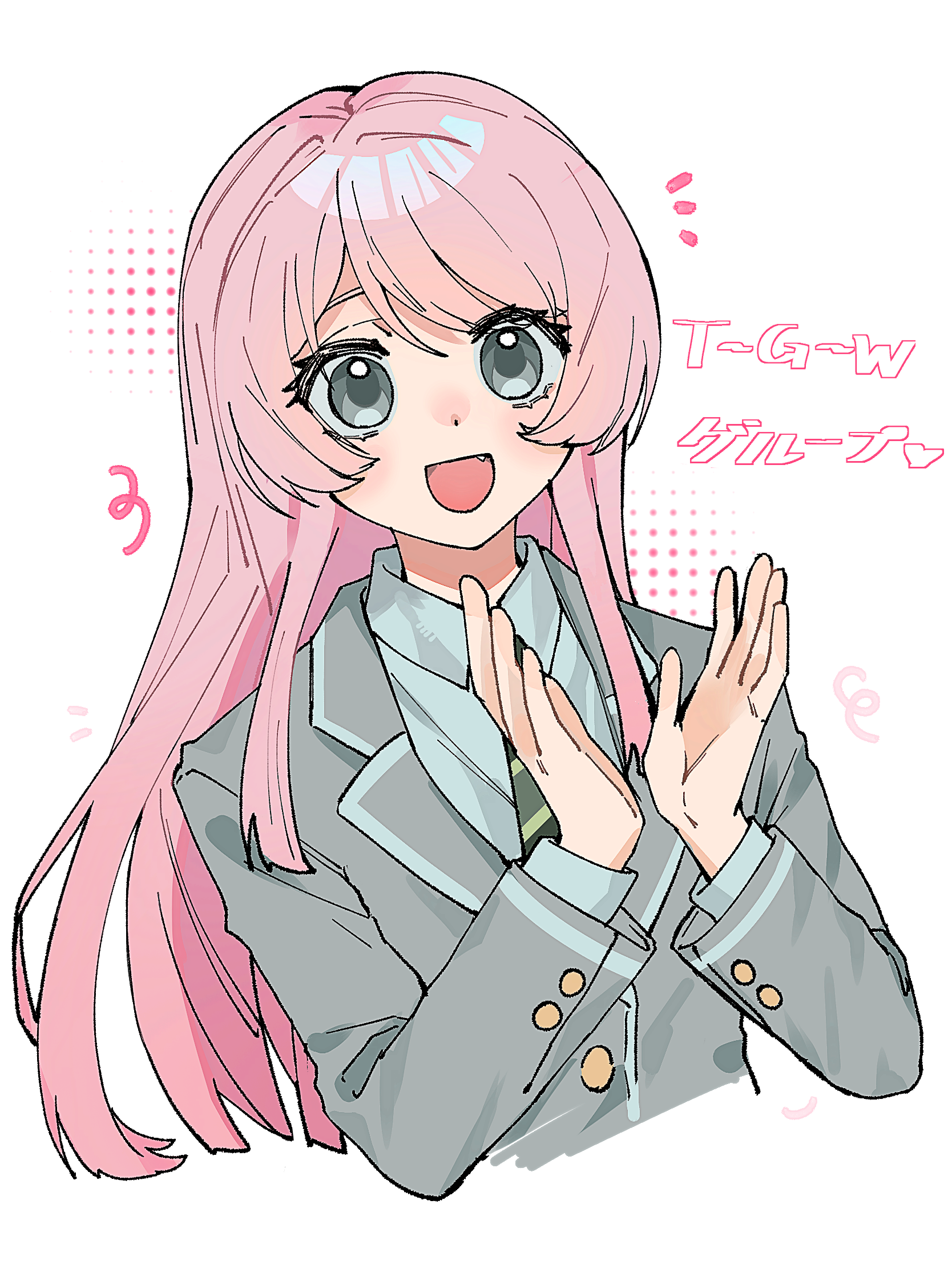 :d1girlblazerblushcollared shirtcropped torsodiagonal-striped clothesdiagonal-striped necktiedot nosedotted backgrounddress shirtfanggreen necktiegrey eyesgrey jacketgrey shirthands uphaneoka school uniformheartjacketlapelslong hairlong sleeveslooking at viewermicaaaanecktienotched lapelsnotice linesopen mouthpink hairschool uniformshirtside partsimple backgroundsmilesolostraight hairstriped clothestogawa group (bang dream!)w armswhite backgroundwinter uniform