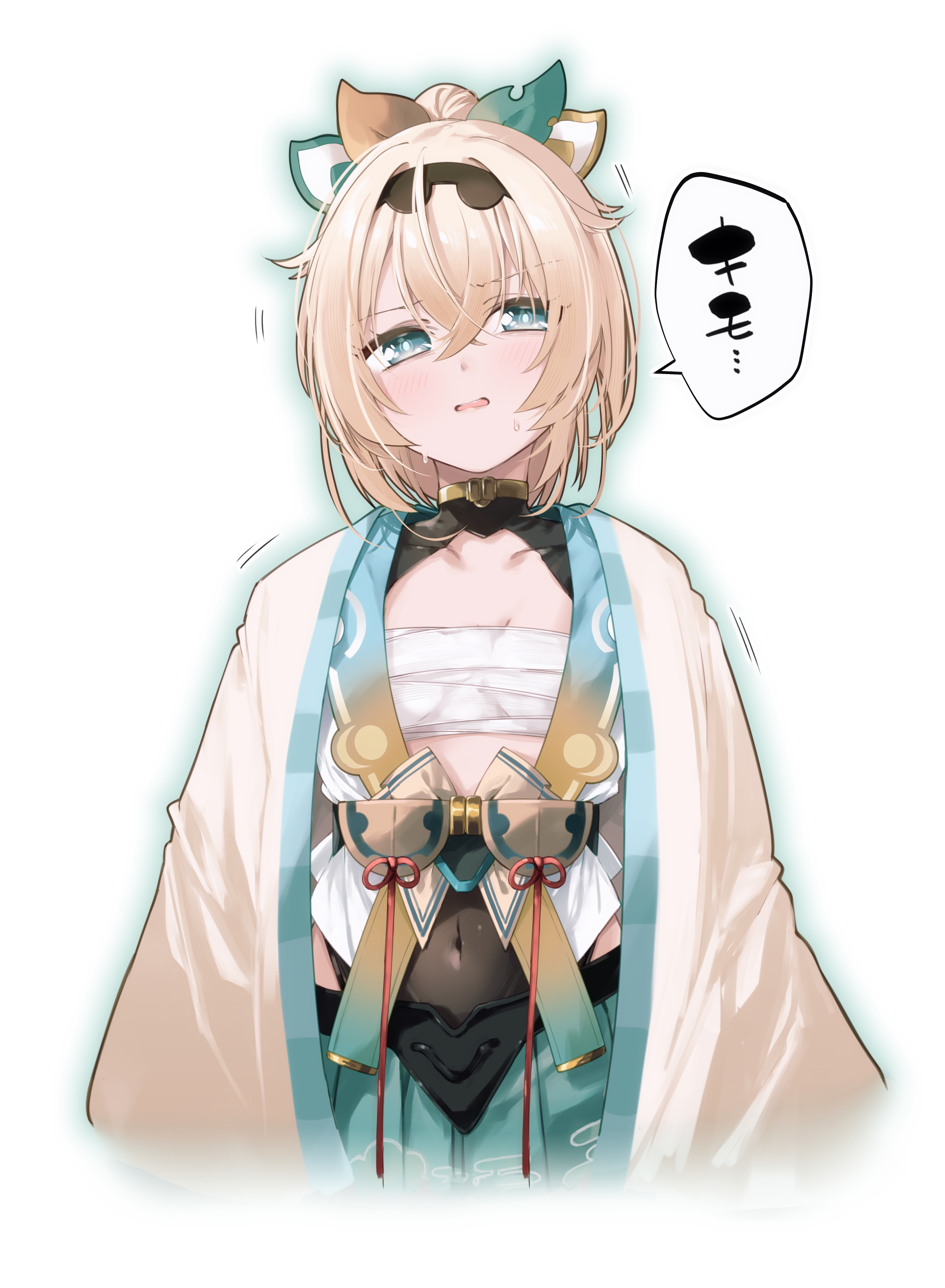 1girlaqua eyesblonde hairblushbowbreastschest sarashidisgustfrownfurrowed browglaringgrimacehair between eyeshair ornamenthairbandhaorijapanese clothesleaf hair ornamentlong hairlooking at viewermedium breastsmulticolored bowopen mouthponytailsarashiscowlsolospeech bubbletanukivirtual youtuberyellow haori