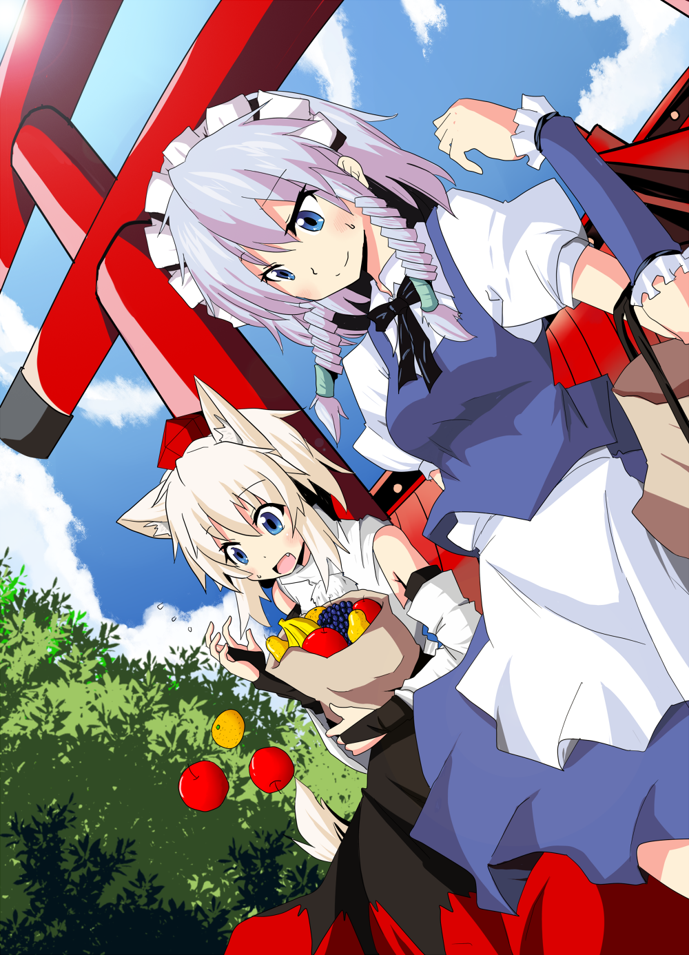 2girlsanimal earsblue eyesbraiddetached sleevesfangfemale focusfoodfruithairbandhatmultiple girlstailtokin hattoriitwin braidswhite hairwolf earswolf tail