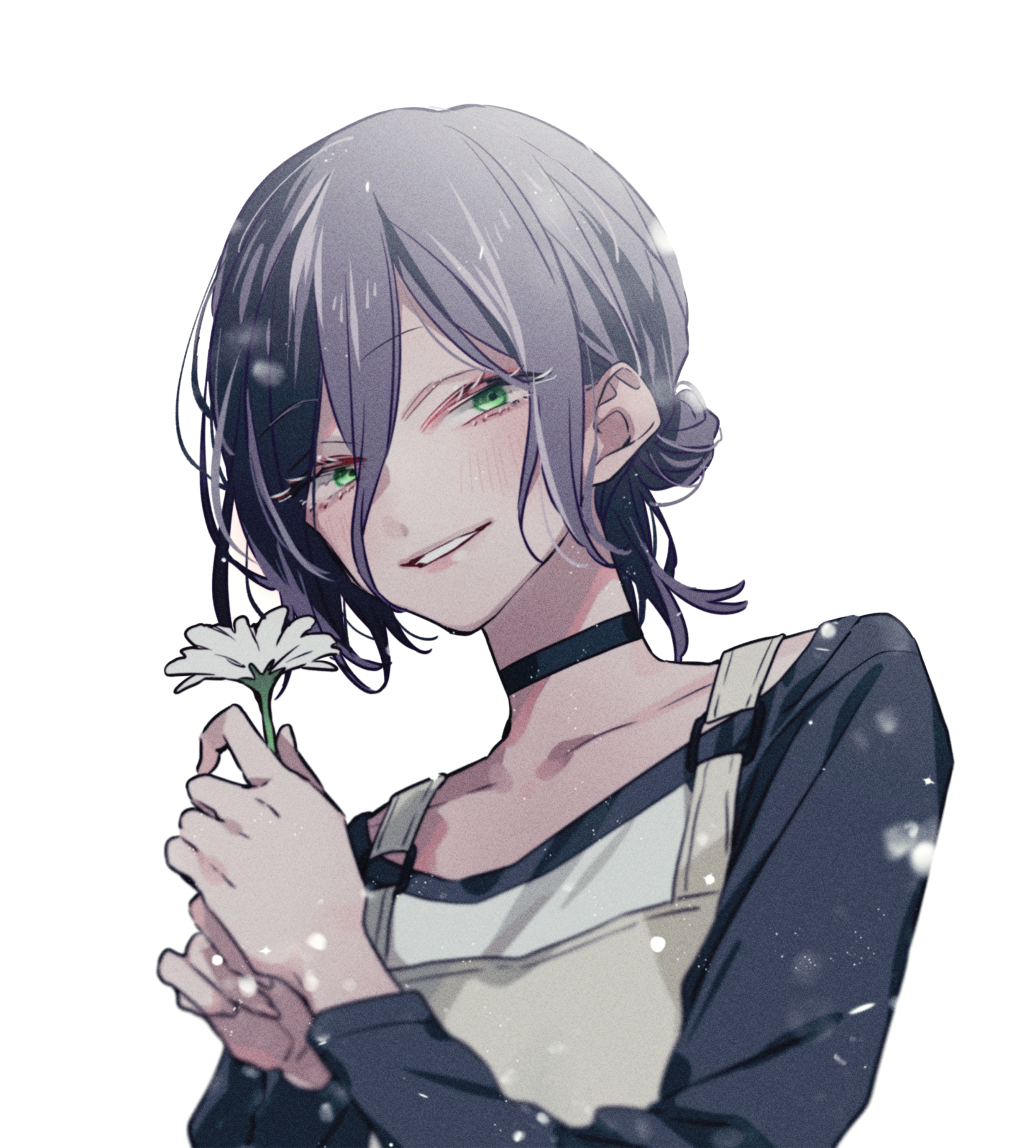 1girlapronblack chokerblack hairblack shirtchokerflowergreen eyesgrey apronhair between eyeshair bunholdingholding flowerlooking at viewernagooooo32shirtsimple backgroundsolotwo-tone shirtwhite backgroundwhite flowerwhite shirt