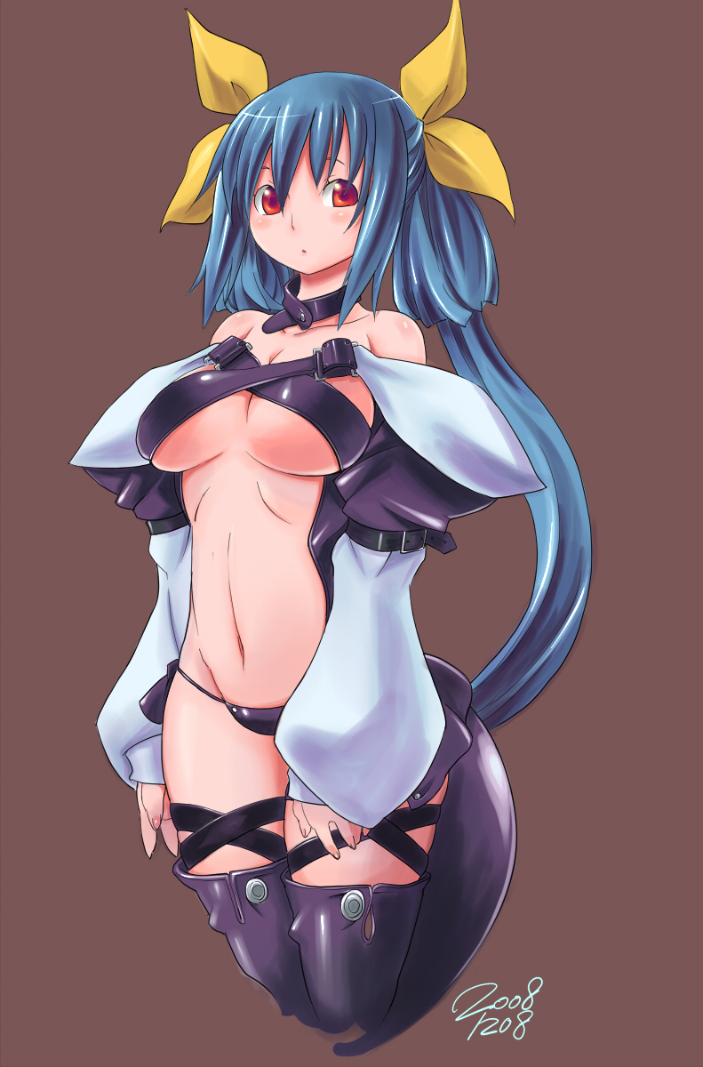 1girlblue hairbowbreastsdetached sleevesfemale focushair bowlarge breastslong hairmidriffnavelsolotailthighhighsunderboob