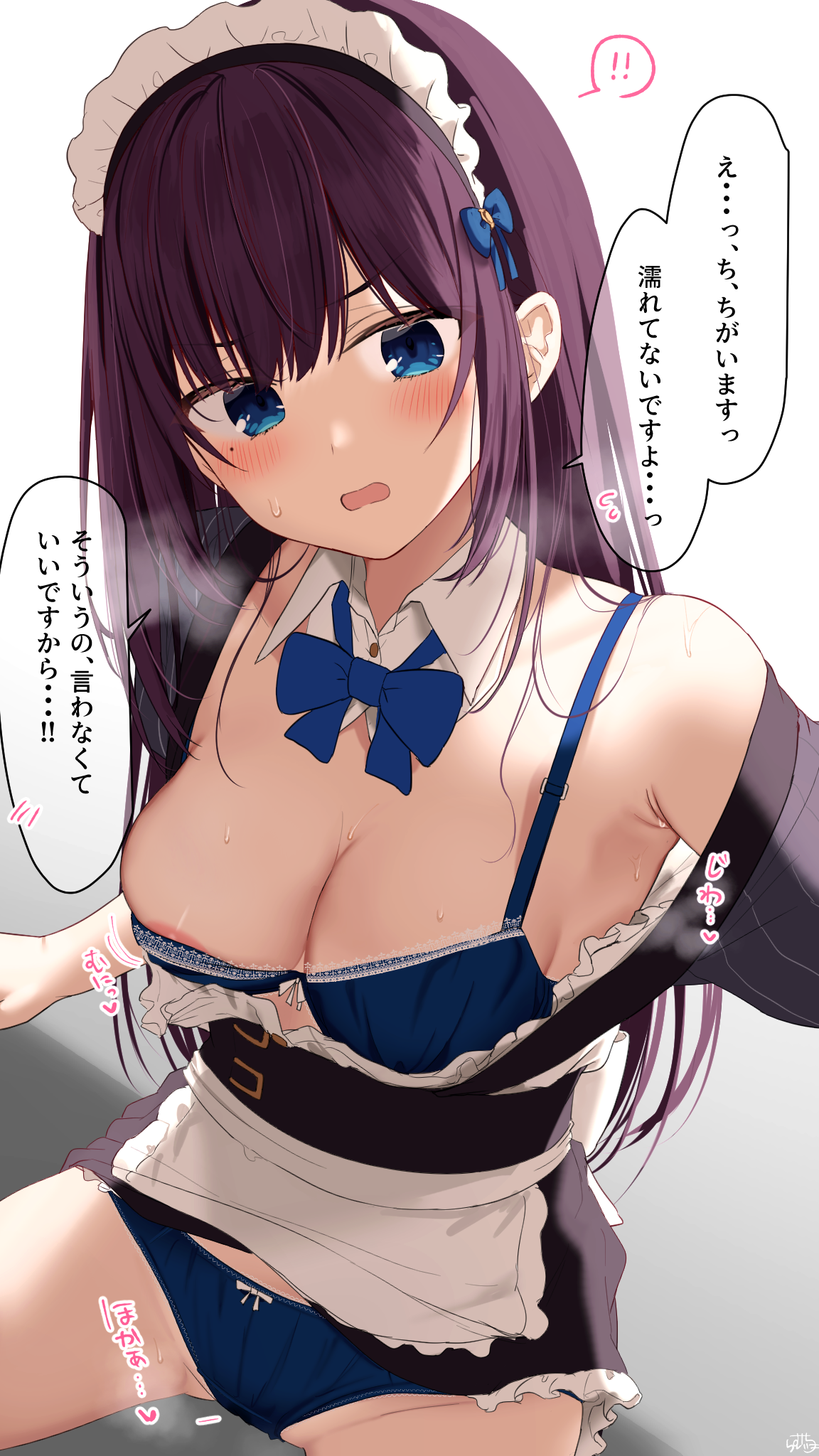 1boy1girlapronarmpit creasebare shouldersblue bowblue bowtieblue eyesblue pantiesblushbowbowtiebra strapbreastscleavagedetached collarhair bowlong hairlooking at viewermaidmaid apronmaid headdressmedium breastsmolemole under eyemotion linesopen mouthpantiespartially undressedpurple hairsidelockssolospeech bubblesweatswept bangsunderwear