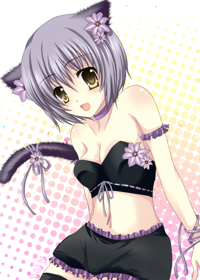 1girlanimal earsblue hairbreastscat earscat tailcleavagefemale focusflowerlarge breastssolotailthighhighsyellow eyes