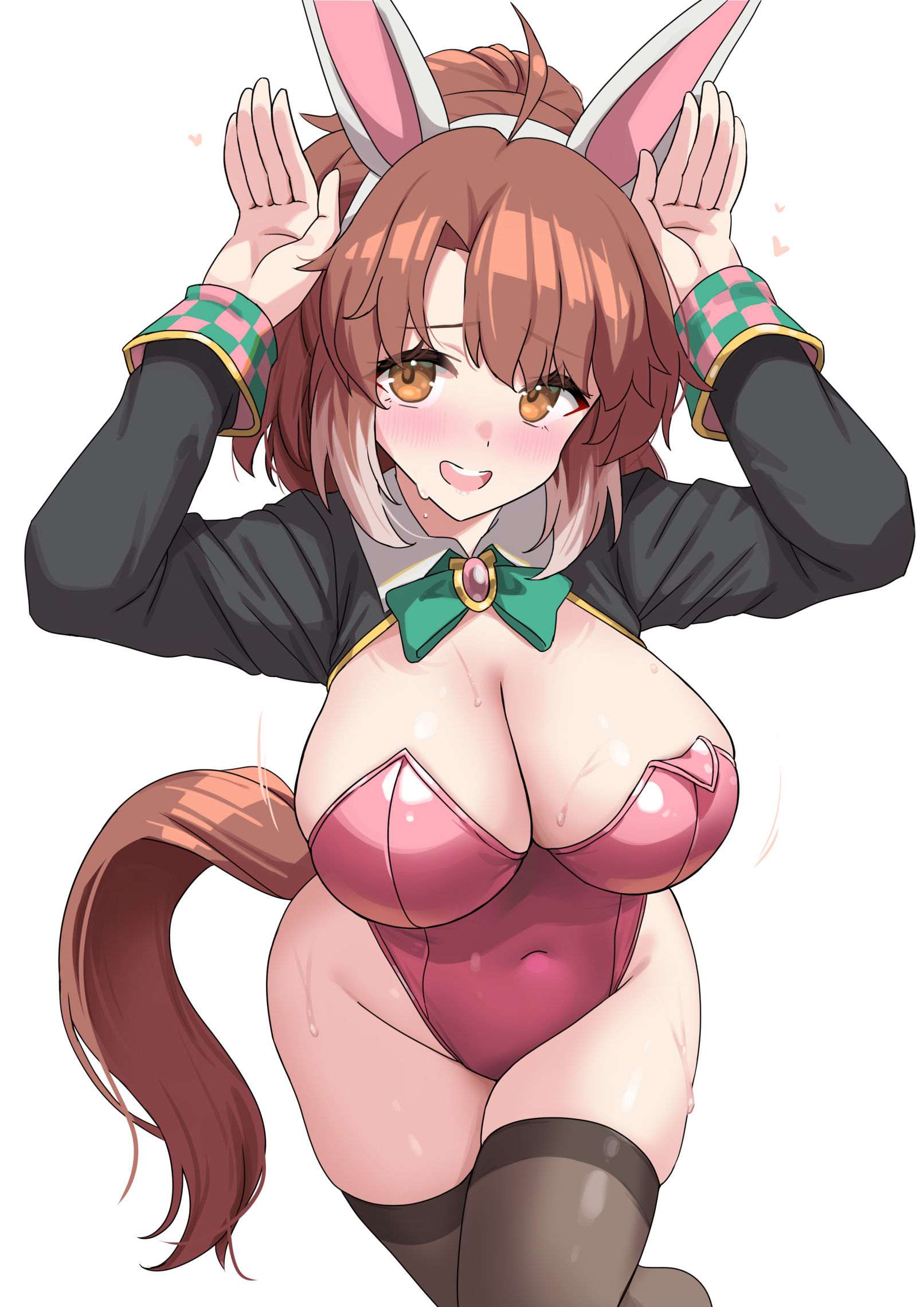 1girlalternate costumeanimal ear hairbandanimal earsarms upblack shrugblack thighhighsblushbowbowtiebreastsbrown eyesbrown hairbrown tailcleavagecowboy shotfake animal earsgreen bowgreen bowtiehairbandhighleghighleg leotardhorse earshorse girlhorse taillarge breastsleaning forwardleotardlong hairlooking at viewernervous smileopen mouthpink leotardrabbit ear hairbandrabbit earsshrug (clothing)simple backgroundskindentationsmilesolostraplessstrapless leotardsweattailthighhighsthighswhite backgroundwhite streaks