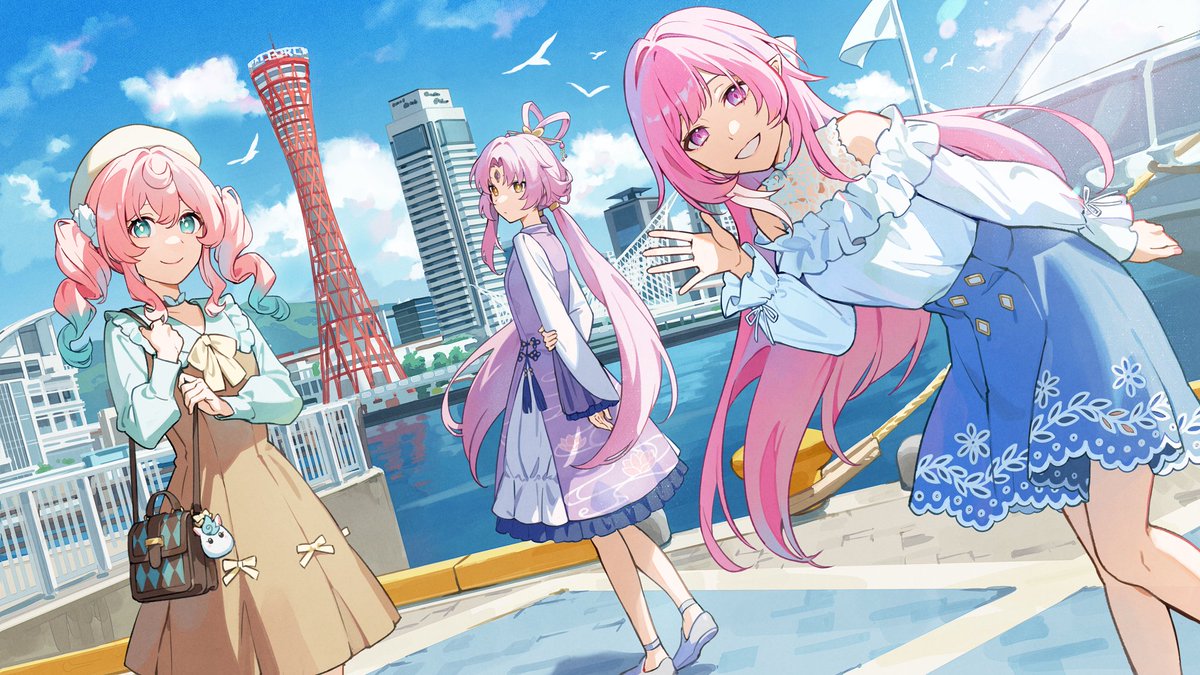 3girlsaqua eyesaqua hairbagbirdblue dressblue skybrown dressbuildingdressguest arthandbagkobekobe port towerlooking at viewermulticolored hairmultiple girlsoutdoorspink hairpointy earspurple dresspurple eyesseagullskyskyscrapertwintailstwo-tone hairwateryellow eyes