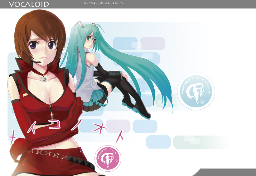 2girlsaqua hairbreastsbrown haircleavagedetached sleeveselbow glovesglovesgreen eyeslarge breastslong hairmidriffmultiple girlsshort hairtwintails