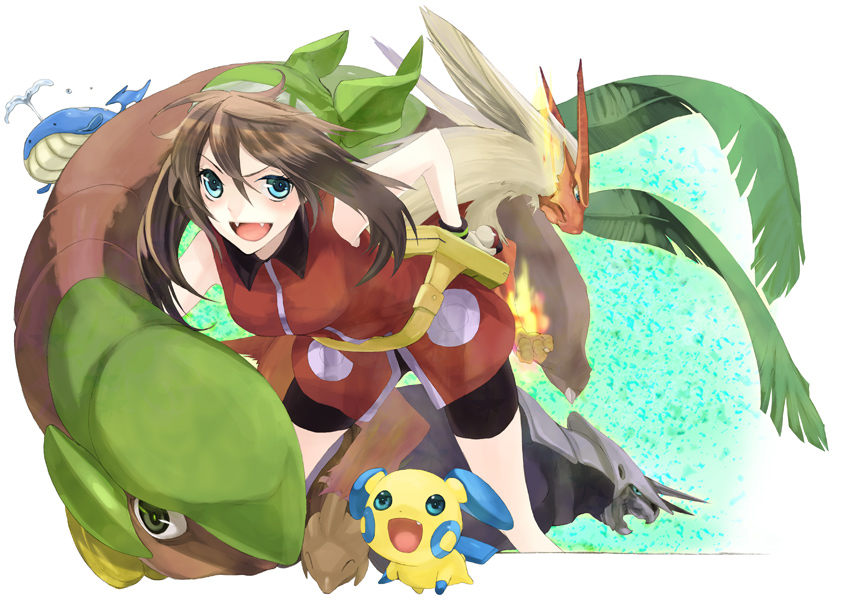 1girlalternate costumebandanabare shouldersbeaniebent overbike shortsblue eyesbrown hairfangfangsfanny packfireflaming handgen 3 pokemongreen eyesgrinhand on own hiphathip focusholdingholding poke ballhornsleafopen mouthpoke ballpokemon (creature)short hairsmile