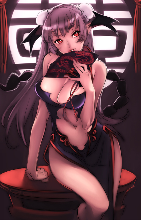 1girlbreastsbun coverchina dresschinese clothescleavagedouble bundressfemale focusfolding fanhair bunhand fanhead wingsholdingholding fanlarge breastslong hairmidriffnaughty facenavelpointy earsred eyessolowings