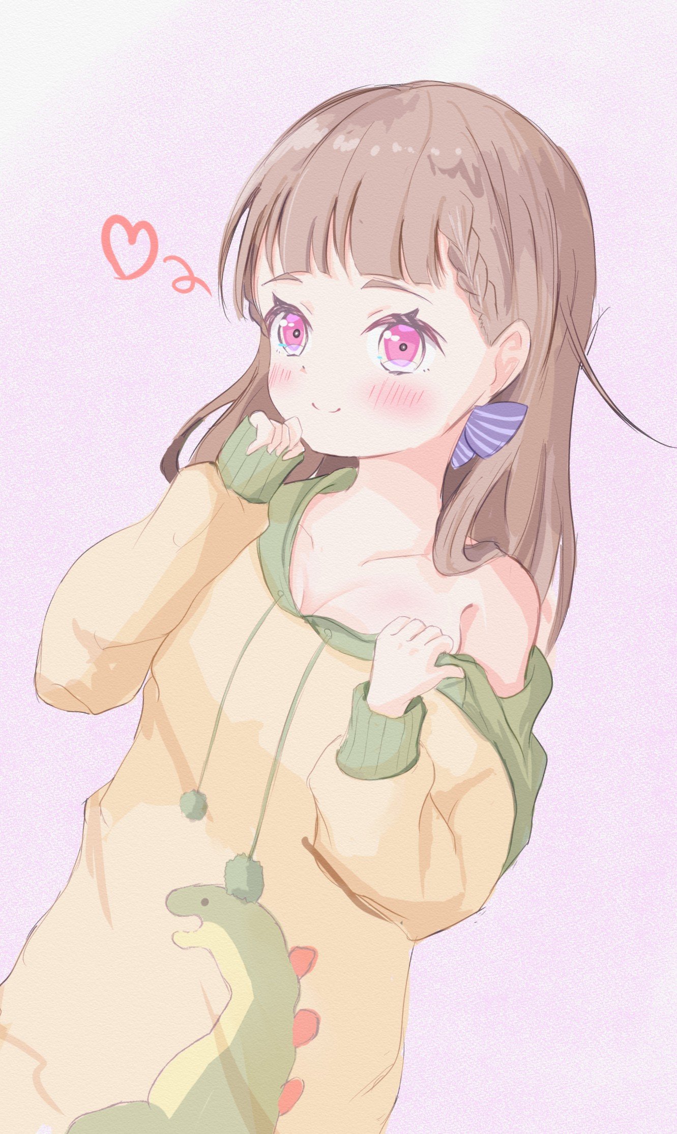 1girlbreastsbrown haircollarbonehearthoodhoodielong hairlong sleeveslooking at viewermedium breastsofficial alternate costumepink backgroundpink eyesside ahogesolostraight-onupper bodyvirtual youtuberyellow hoodie