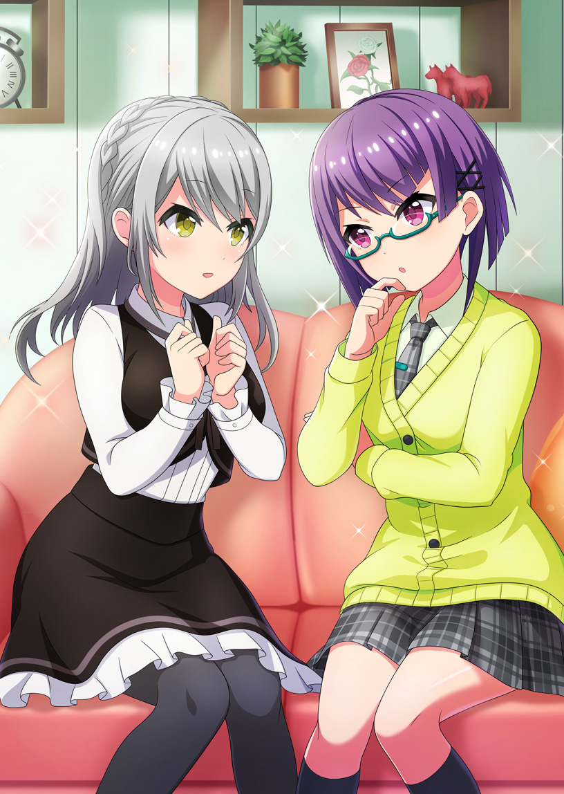 :o2girlsalarm clockanalog clockblack pantyhoseblack skirtblack socksblack vestblushbraidbreastsbuttonscardiganclockcouchcrown braiddot noseglassesgreen cardigangreen eyesgreen-framed eyeweargrey hairgrey necktiegrey skirthair ornamenthand on own chinhands upindoorslens flarelong sleevesmedium breastsmedium hairmultiple girlsnecktieopen mouthpantyhosepicture frameplaid clothesplaid necktieplaid skirtplantpotted plantpurple eyespurple hairsemi-rimless eyewearshelfshirtshort hairsittingskirtsockssparkleunder-rim eyewearvestwall shelfwhite shirtx hair ornament