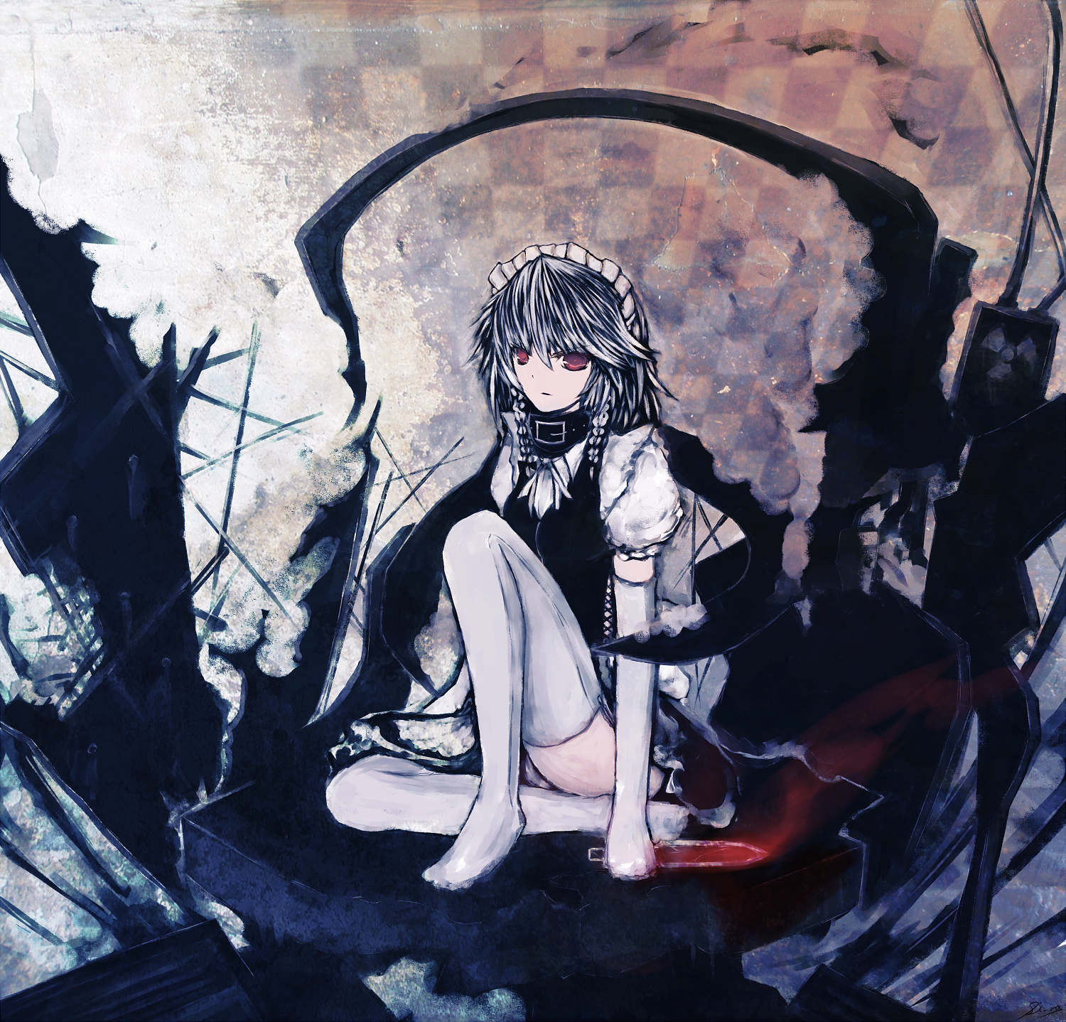 1girlbloodbraidcollarfemale focushairbandknifered eyesscarfshort hairsolothighhighsthrowing knifetwin braidsweapon