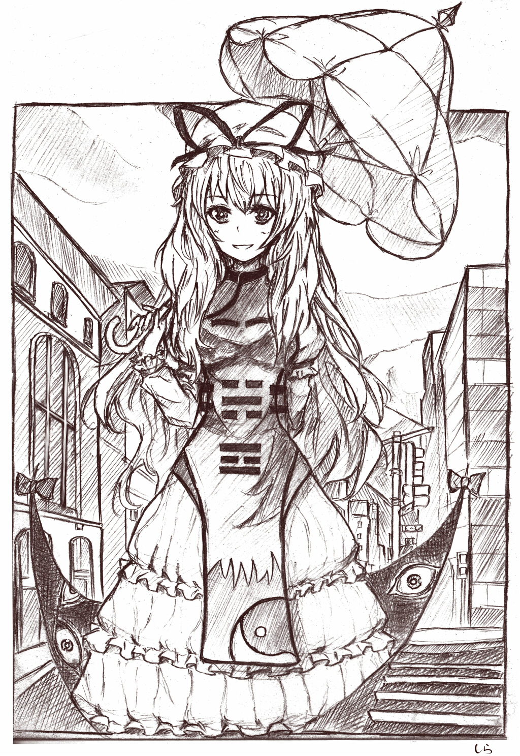kobayashi yuji, highres, 1girl, artist name, book, clock, dress, eraser, female focus, hair ornament, indoors, looking at viewer, mechanical pencil, mini person, minigirl, pencil, sitting, solo, twintails, wariza