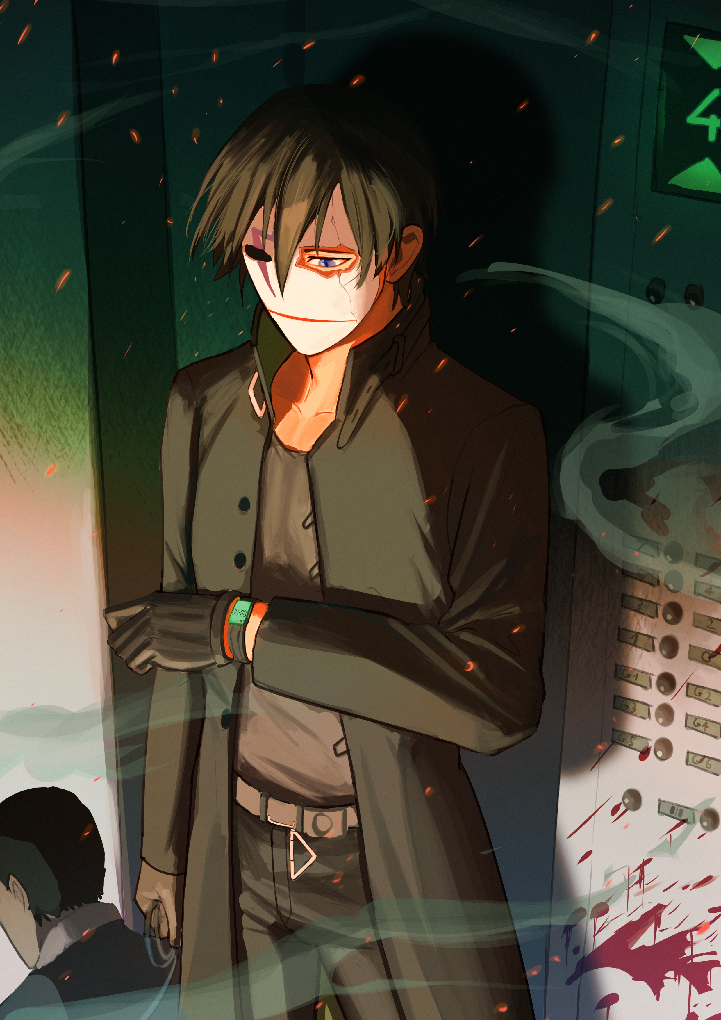 2boysbeltblack coatblack glovesblack hairblack pantsbloodblood splatterblue eyescoatcowboy shotcracked maskdeathelevatorembersglovesholdingmale focusmultiple boysopen clothesopen coatpantspurple eyesshadowsolo focussparksstandingwatchwristwatch