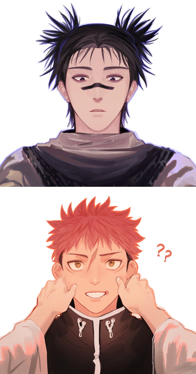 1boy2boysblack eyesblack hairblack shirtcheek pinchingfacial markgrinlooking at anothermale focusmultiple boysparted lipspinchingpink hairscarscar on faceshirtsideburnssmilespiked hair