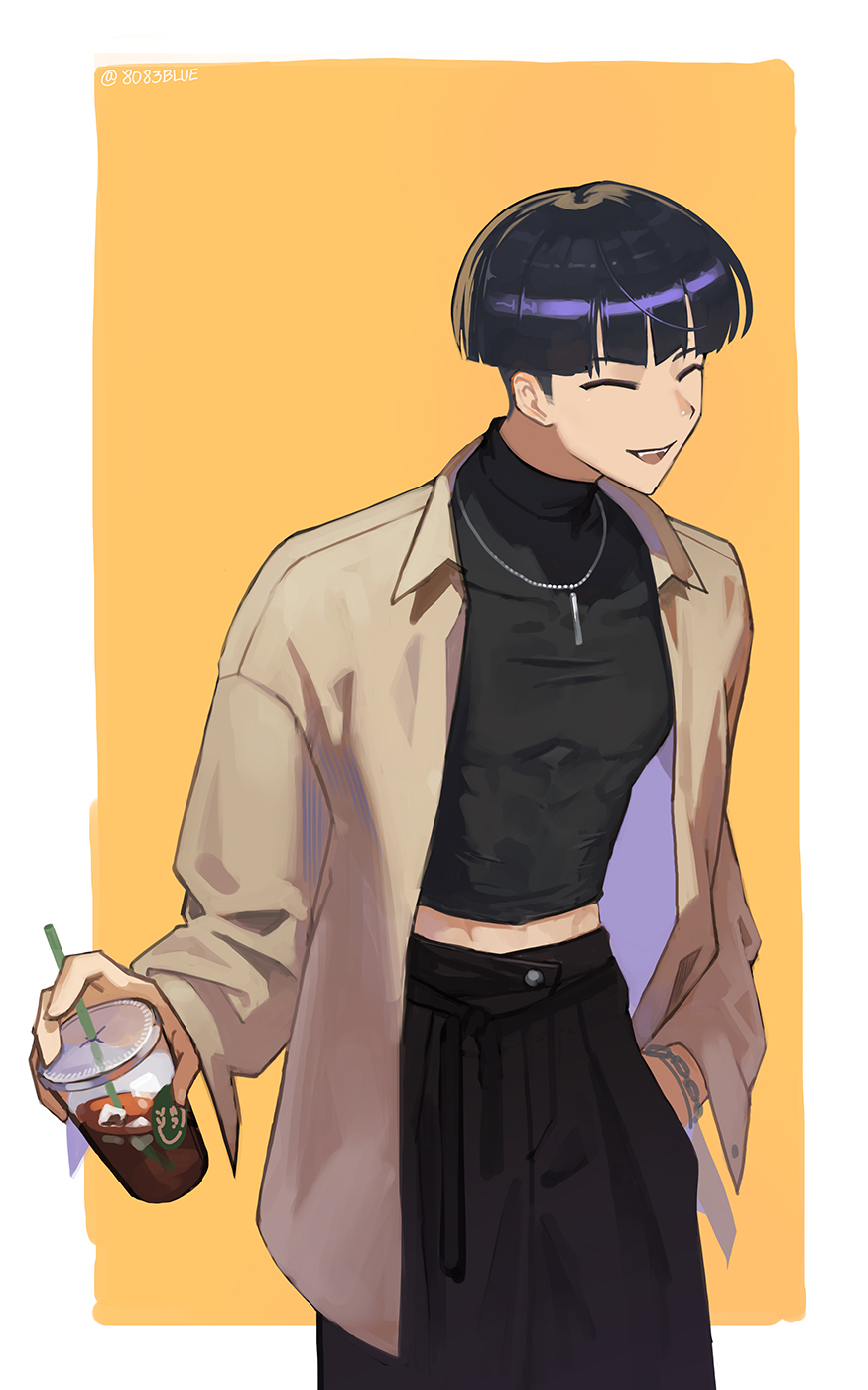 1boyblack hairblack pantsblack shirtborderbowl cutcowboy shotcupdisposable coffee cupdisposable cupfacing aheadgrey jacketholdingholding cupjacketjewelrylong sleevesmale focusmidriffmidriff peeknecklacepantsshirtshort hairsideburnssolowhite border