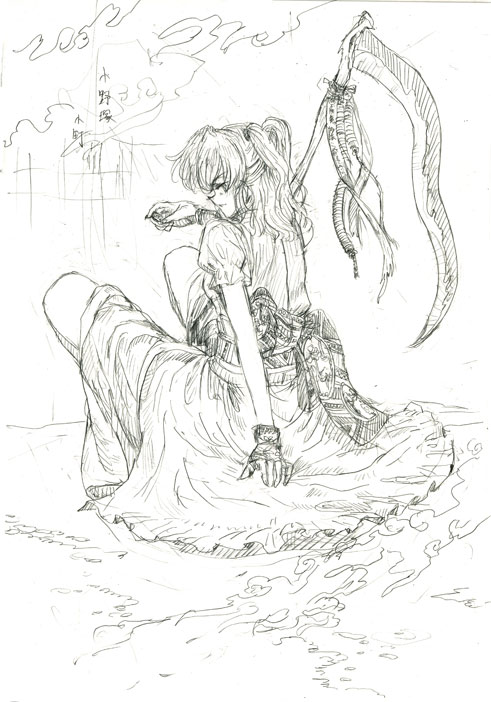 1girlcupfemale focusfrom behindgreyscalemonochromesakazukiscythesittingsketchsolotwintailstwo side up