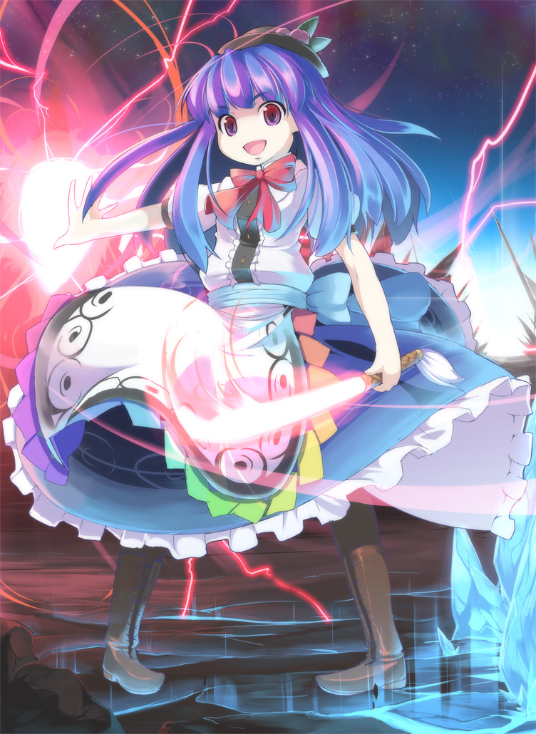 1girlblue hairbootsdressfemale focusfull bodygradient backgroundhatlong hairred eyesribbonskirtsoloswordsword of hisouweapon